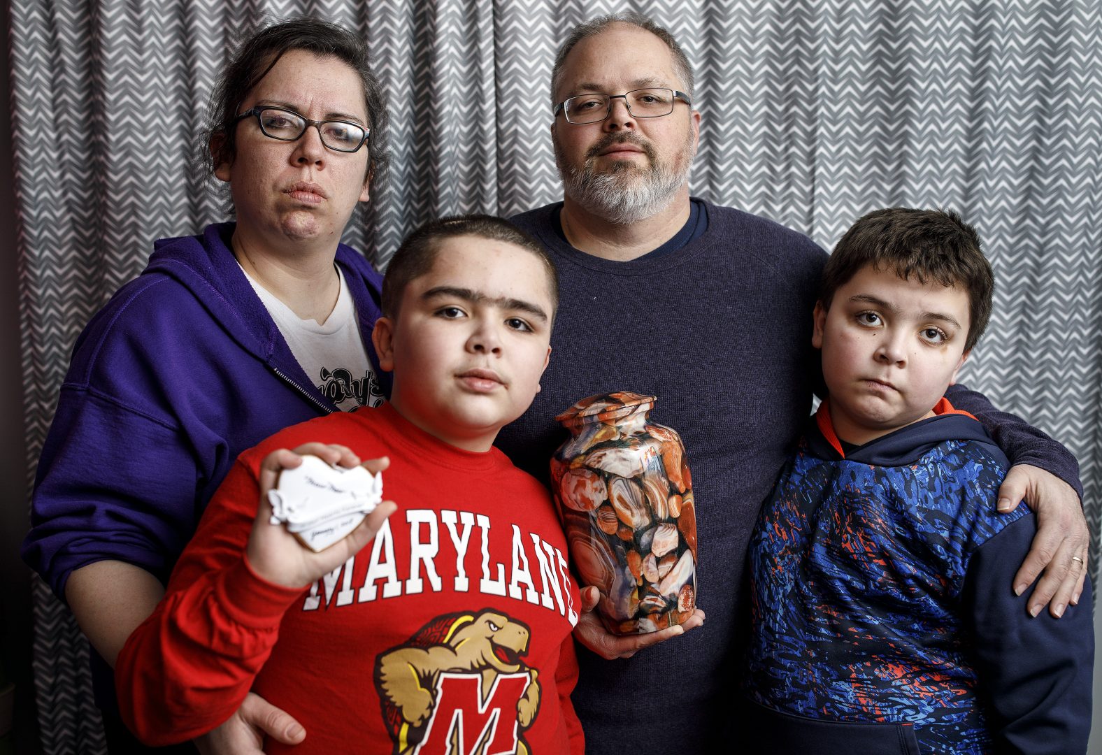 Richard Mantheiy with wife Ashley and sons Benjamin, left, and Drake, and the urn containing the ashes of Richard’s mother, Sharon, and a poster that was displayed at her funeral.