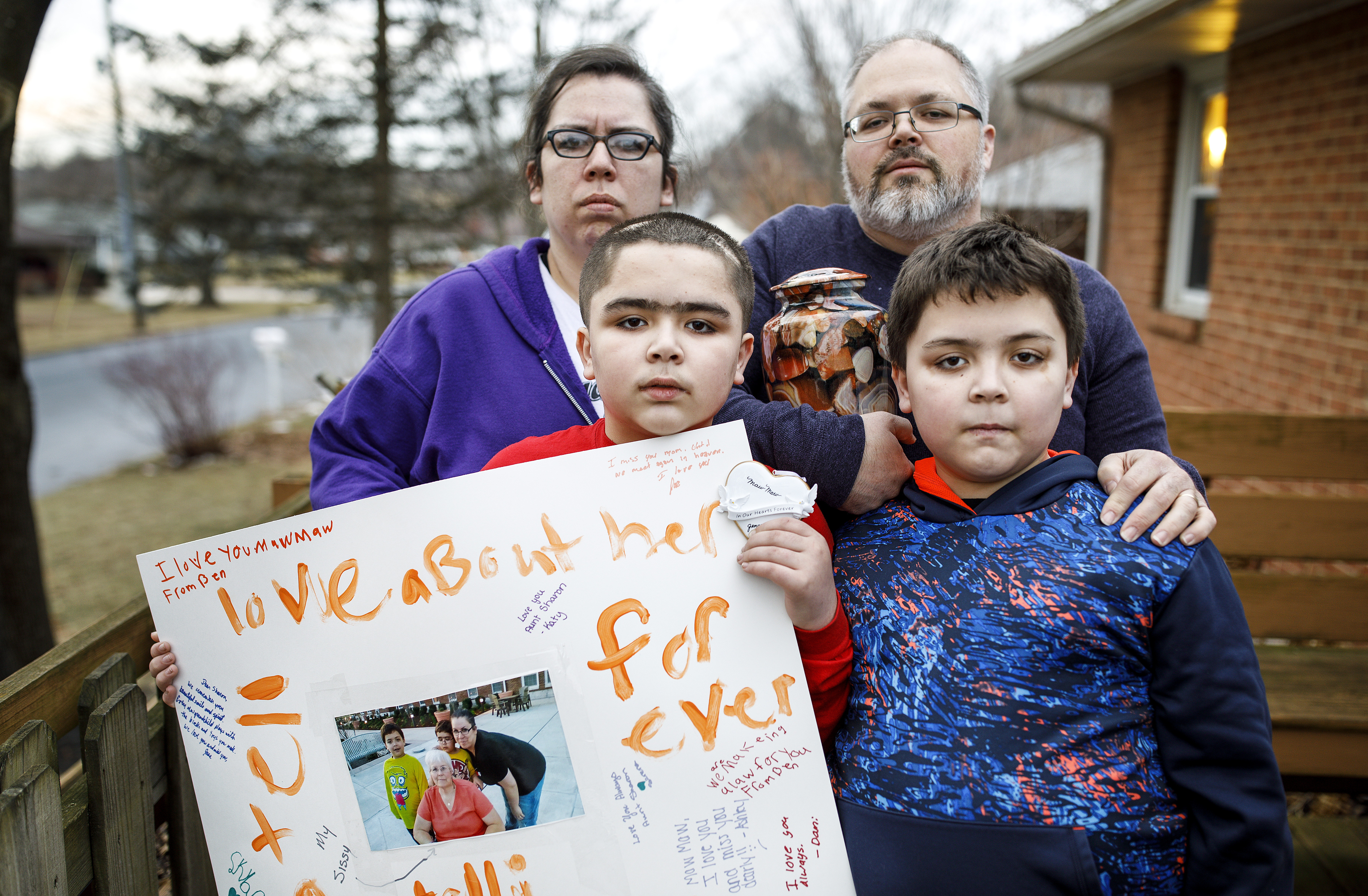 Richard Mantheiy with wife Ashley and sons Benjamin, left, and Drake, and the urn containing the ashes of Richard's mother, Sharon. Richard Mantheiy lost his 67-year-old mother due to what he says was understaffing and poor care at an East Pennsboro Township nursing home. Sharon Mantheiy died from sepsis caused by a stage four pressure ulcer measuring 14 centimeters.
