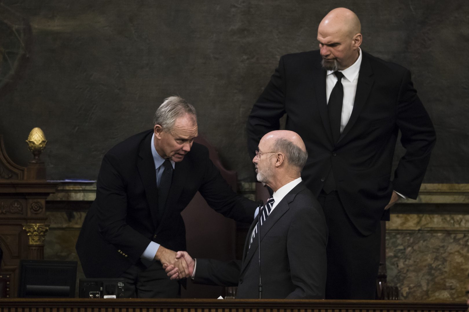 House Speaker Mike Turzai, Gov. Tom Wolf, and Lt. Gov. John Fetterman at Wolf’s budget address before the Legislature. Republicans expressed cautious optimism at the governor’s plan, but balked at the proposed spending increases.
