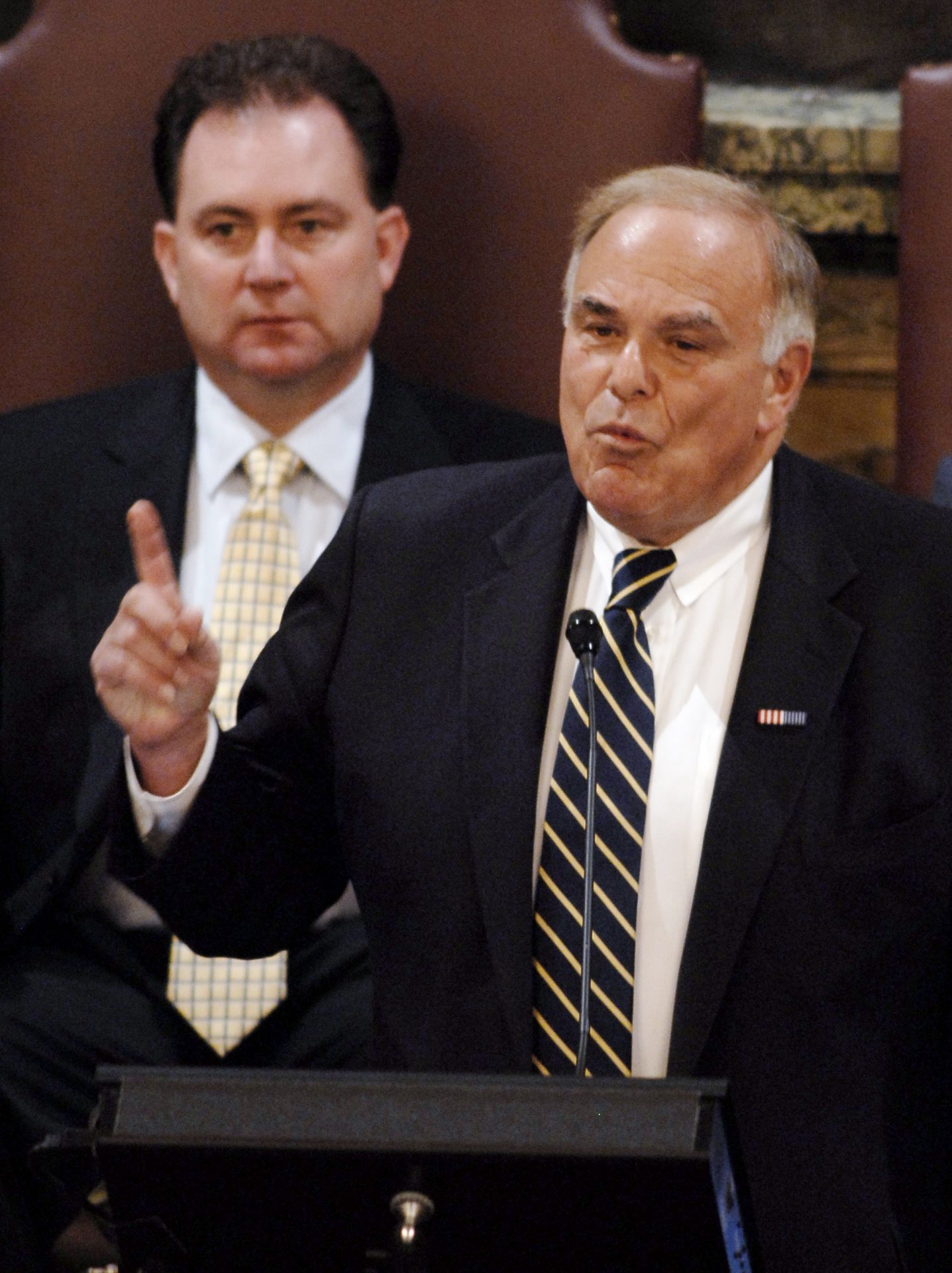 Pennsylvania Gov. Ed Rendell, right, gives his annual budget address at the state capitol as the Speaker of the House, Keith McCall, D-Carbon, left, looks on Wednesday, Feb. 4, 2009 in Harrisburg, Pa. Rendell proposed reducing the number of school districts in Pennsylvania to 100. That didn’t happen.
