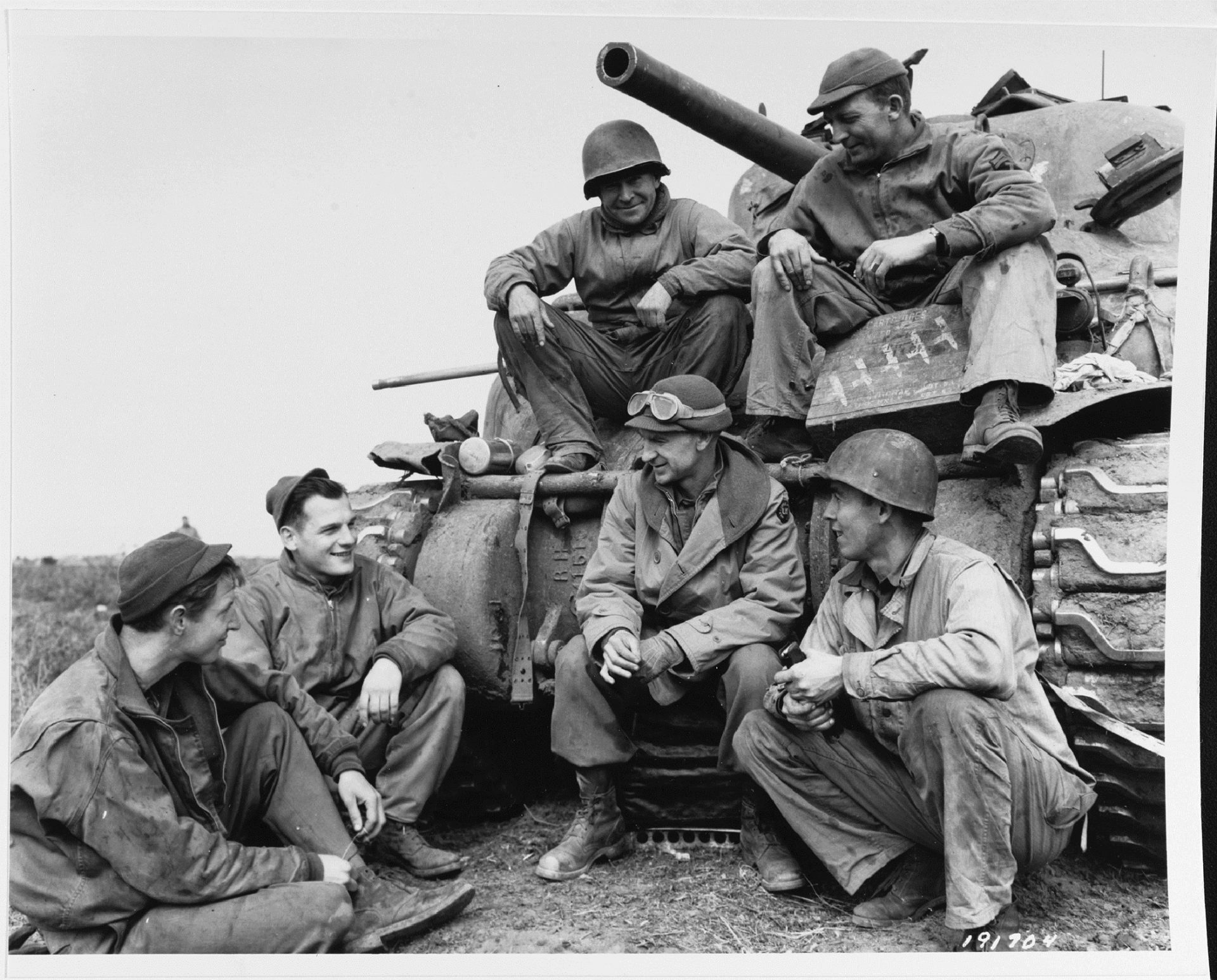 Ernie Pyle visits with a tank crew of the 91st Tank Battalion in the Anzio Beachhead, circa March 1944.
