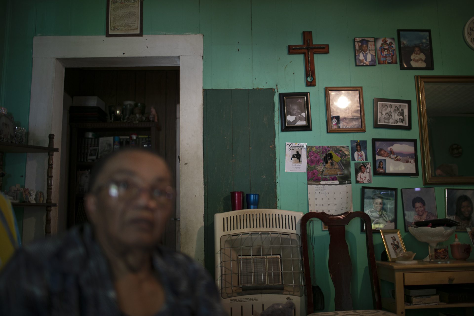 Lou Alice Bolden with a crucifix and framed photographs in her home in Greenwood, Miss., Saturday, June 8, 2019. Known as “Miss Lou,” Bolden has three grandsons who say they were sexually abused at a local Catholic grade school.