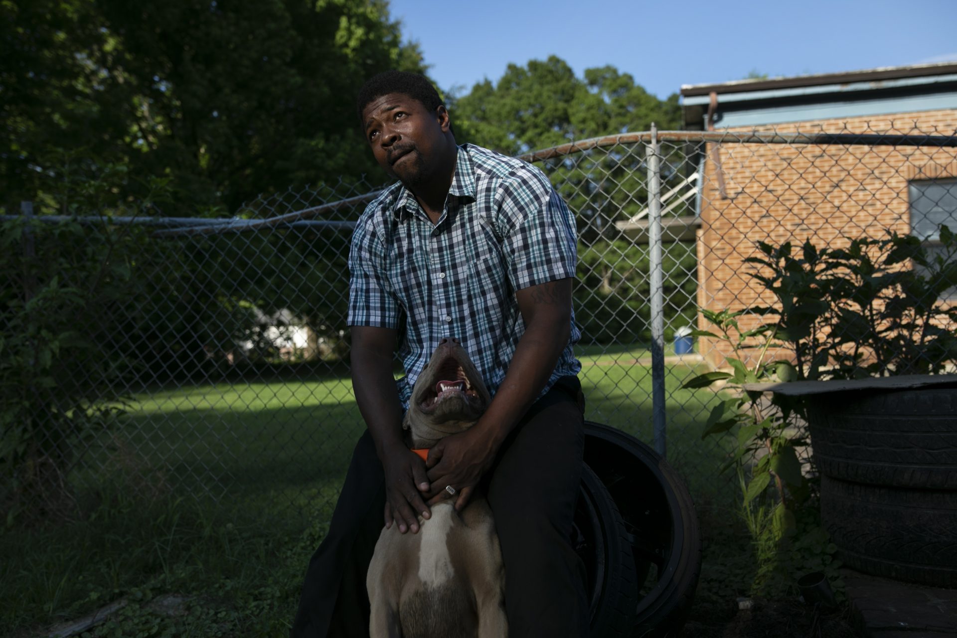 La Jarvis D. Love strokes one of several dogs he keeps at his home in Senatobia, Miss., Sunday, June 9, 2019. Love says the dogs protect his wife and three children.