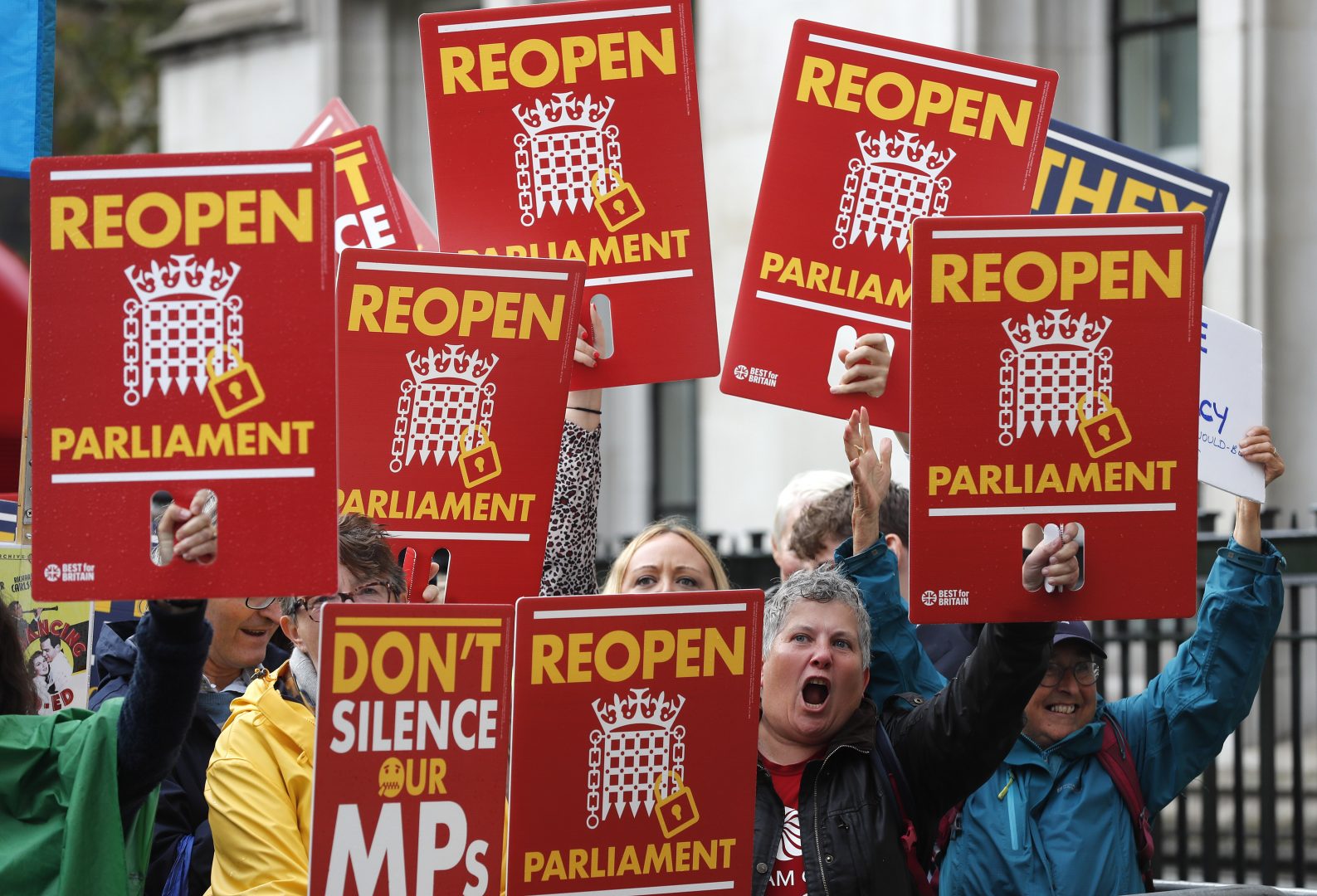 Anti-Brexit supporters react as they gather outside the Supreme Court in London, Tuesday, Sept. 24, 2019 as it made it's decision on the legality of Prime Minister Boris Johnson's five-week suspension of Parliament. In a setback for Johnson, Britain's Supreme Court has ruled that the suspension of Parliament was illegal. The ruling Tuesday is a major blow to the prime minister who had suspended Parliament for five weeks, claiming it was a routine closure.