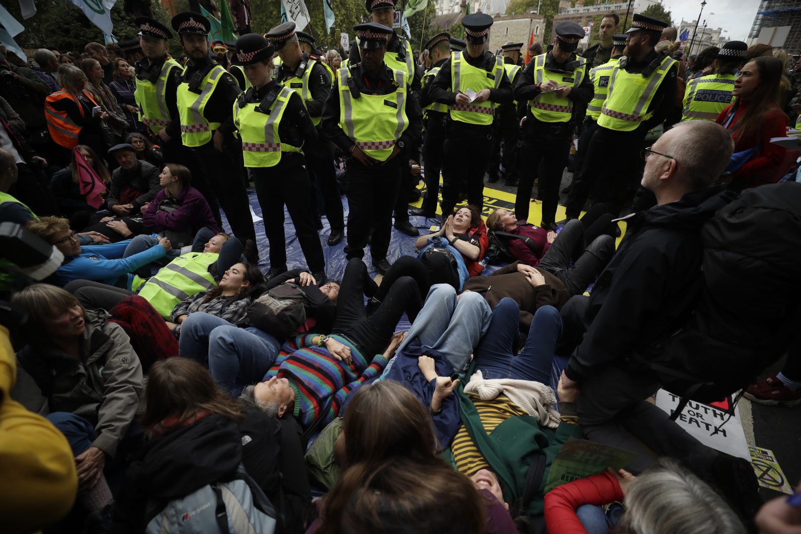 (London) — Hundreds of climate change activists camped out in central London on Tuesday during a second day of world protests by the Extinction Rebellion movement to demand more urgent actions to counter global warming.