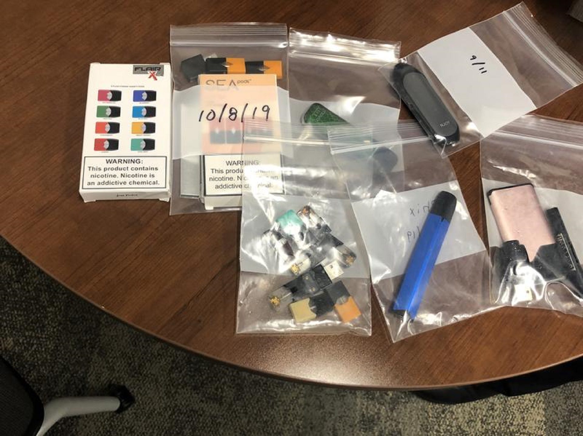 FILE PHOTO: In this Tuesday, April 10, 2018 file photo Marshfield High School Principle Robert Keuther displays vapes that were confiscated from students in Marshfield, Mass.