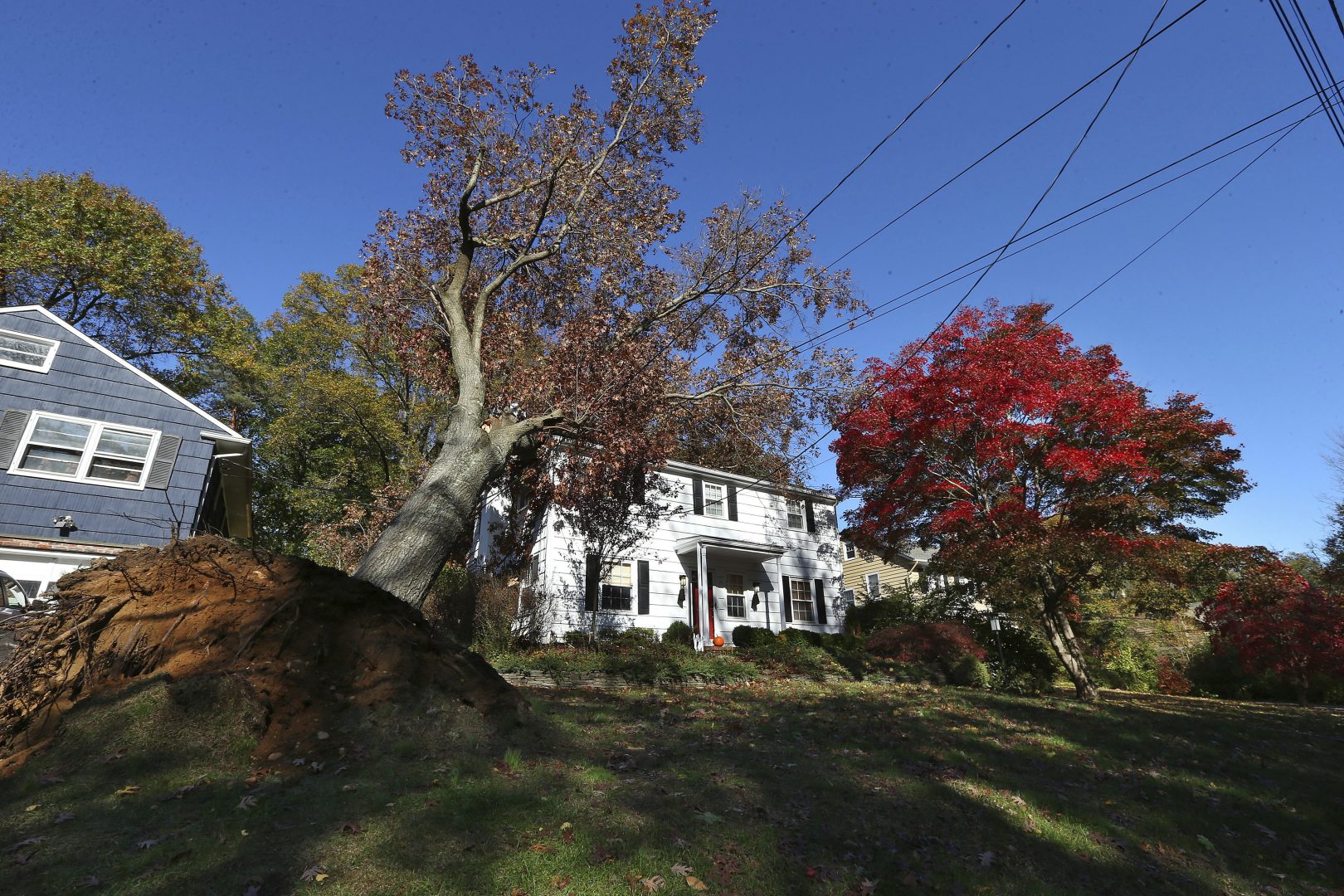 A large Oak tree leans on the roof of a house on Green Village Road on Friday, Nov. 1, 2019, in Madison, N.J. Strong storms and at least one tornado hit Pennsylvania and the East Coast on Oct. 31, 2019.