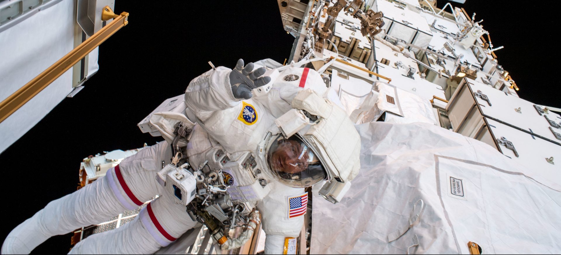 NASA astronaut Andrew Morgan waves to the camera while tethered on the Port 6 (P6) truss segment of the International Space Stations. He and fellow NASA astronaut Christina Koch (out of frame) worked to replace older hydrogen-nickel batteries with newer, more powerful lithium-ion batteries on the P6 truss during the six-hour and 45-minute spacewalk.