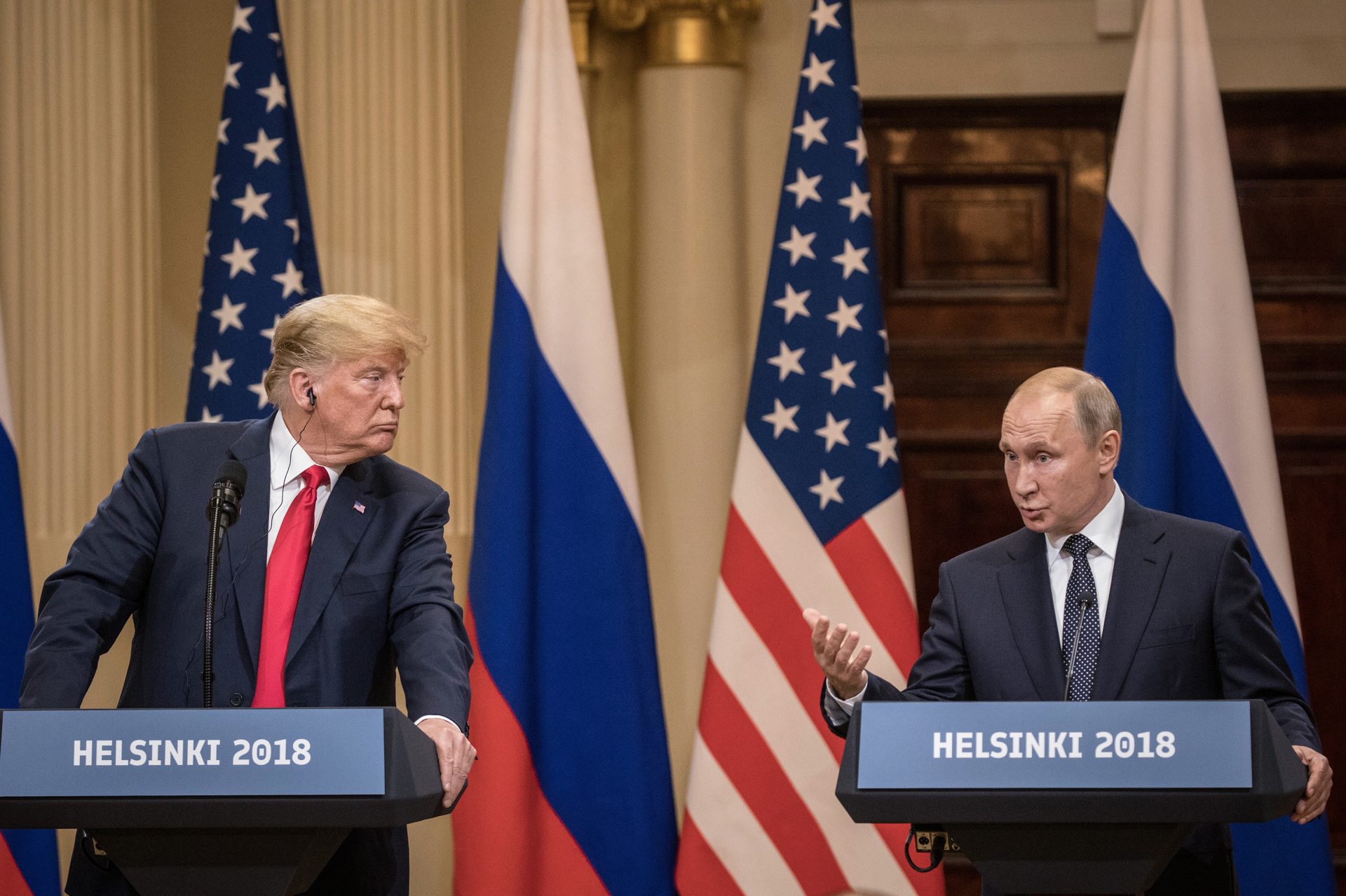 President Trump and Russian President Vladimir Putin answer questions about 2016 U.S. election interference during a joint news conference after their summit on July 16, 2018, in Helsinki.