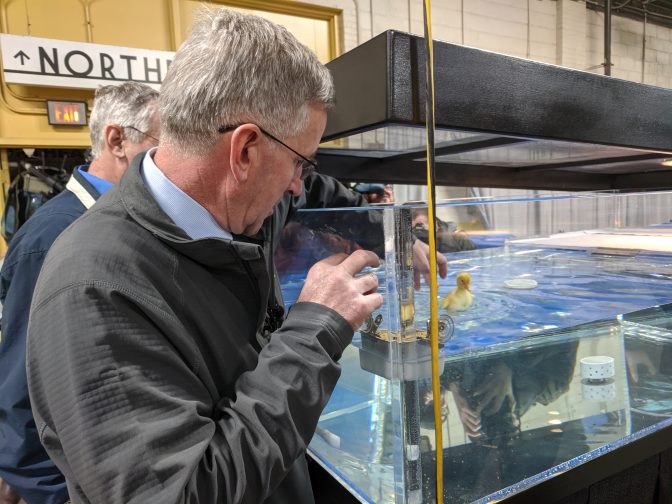 Agriculture Secretary Russell Redding places a duckling into an observation tank at the Farm Show Complex in Harrisburg on Monday, December 30, 2019.