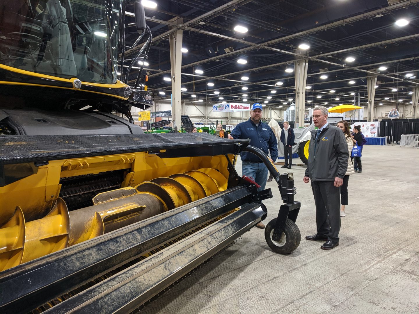 Agriculture Secretary Russell Redding (right) looks at a piece of harvesting equipment with Jason Forrester of Forrester Farm Equipment in Chambersburg, Pa. Redding was giving a tour at the Pennsylvania Farm Show Complex on Monday, December 30, 2019.