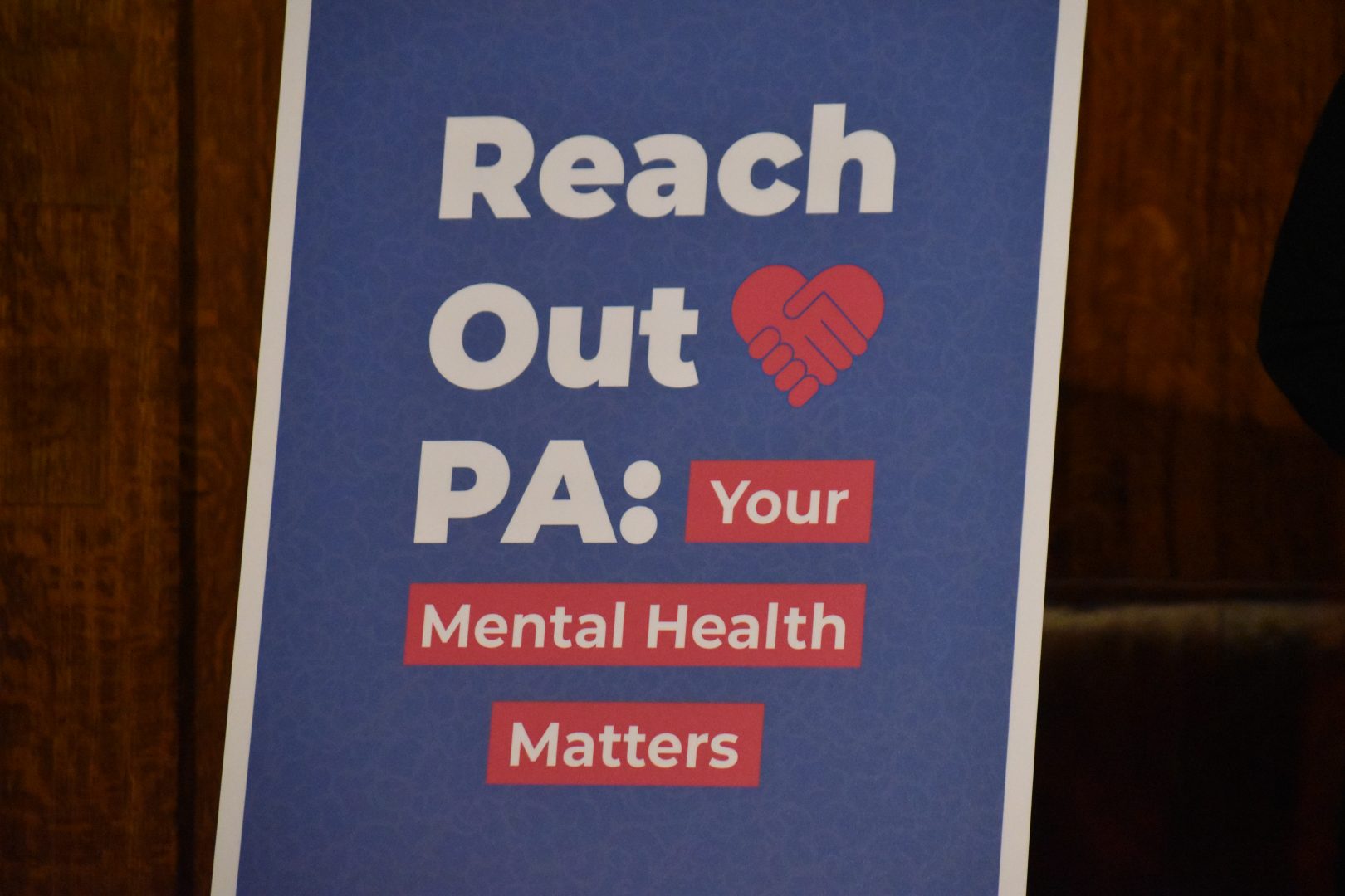 A sign describes the governor's "Reach Out PA: Your Mental Health Matters" plan Thurs., Jan. 2, 2020.