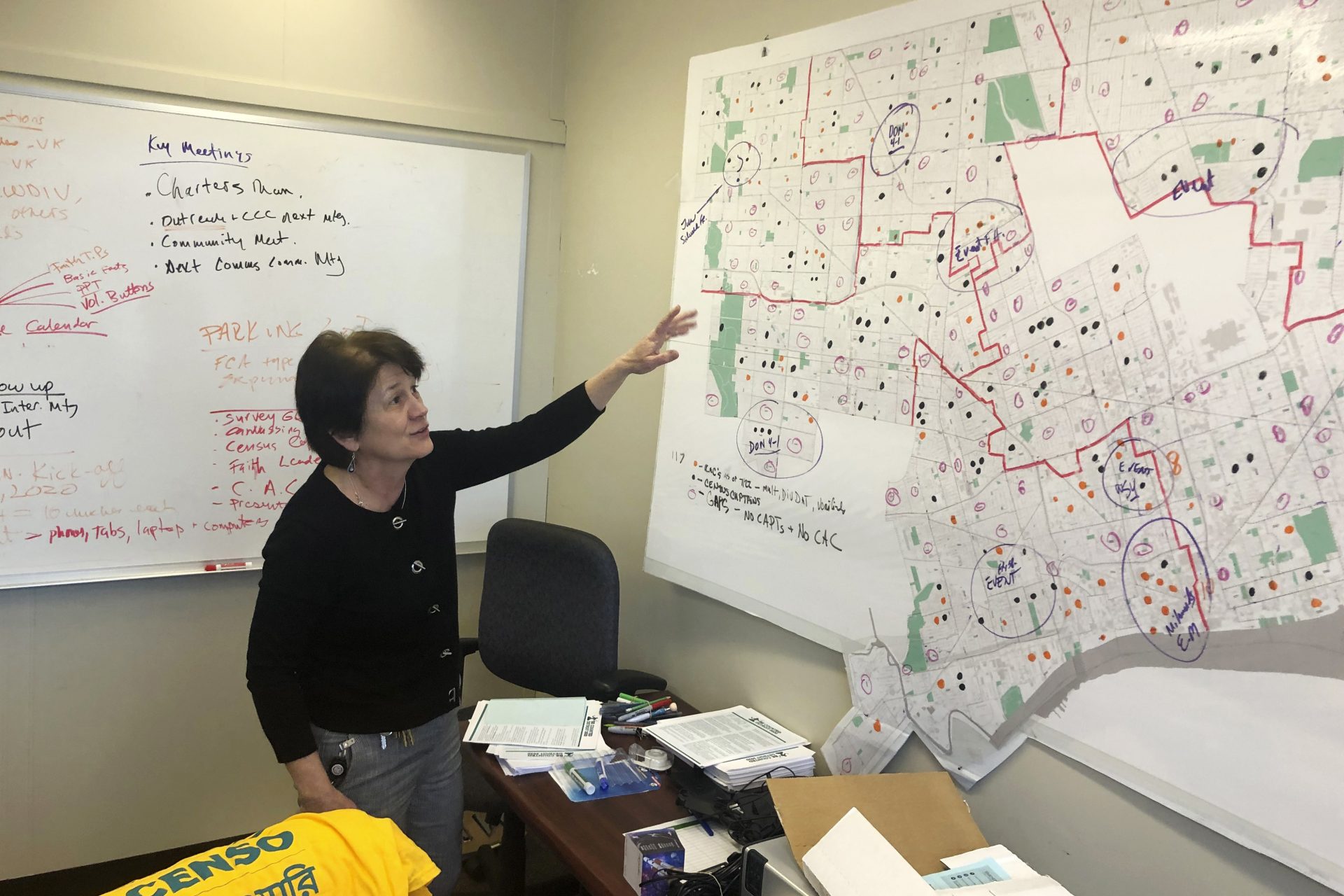 In this Nov. 22, 2019, photo, Detroit 2020 Census Campaign executive director Victoria Kovari looks over a Detroit map showing city neighborhoods that were under-counted in the 2010 census. In 2010, 220,000 Detroit residents were living in households that did not fill out questionnaires, costing the city $2,000 to $5,000 annually for every uncounted person, said Kovari. (