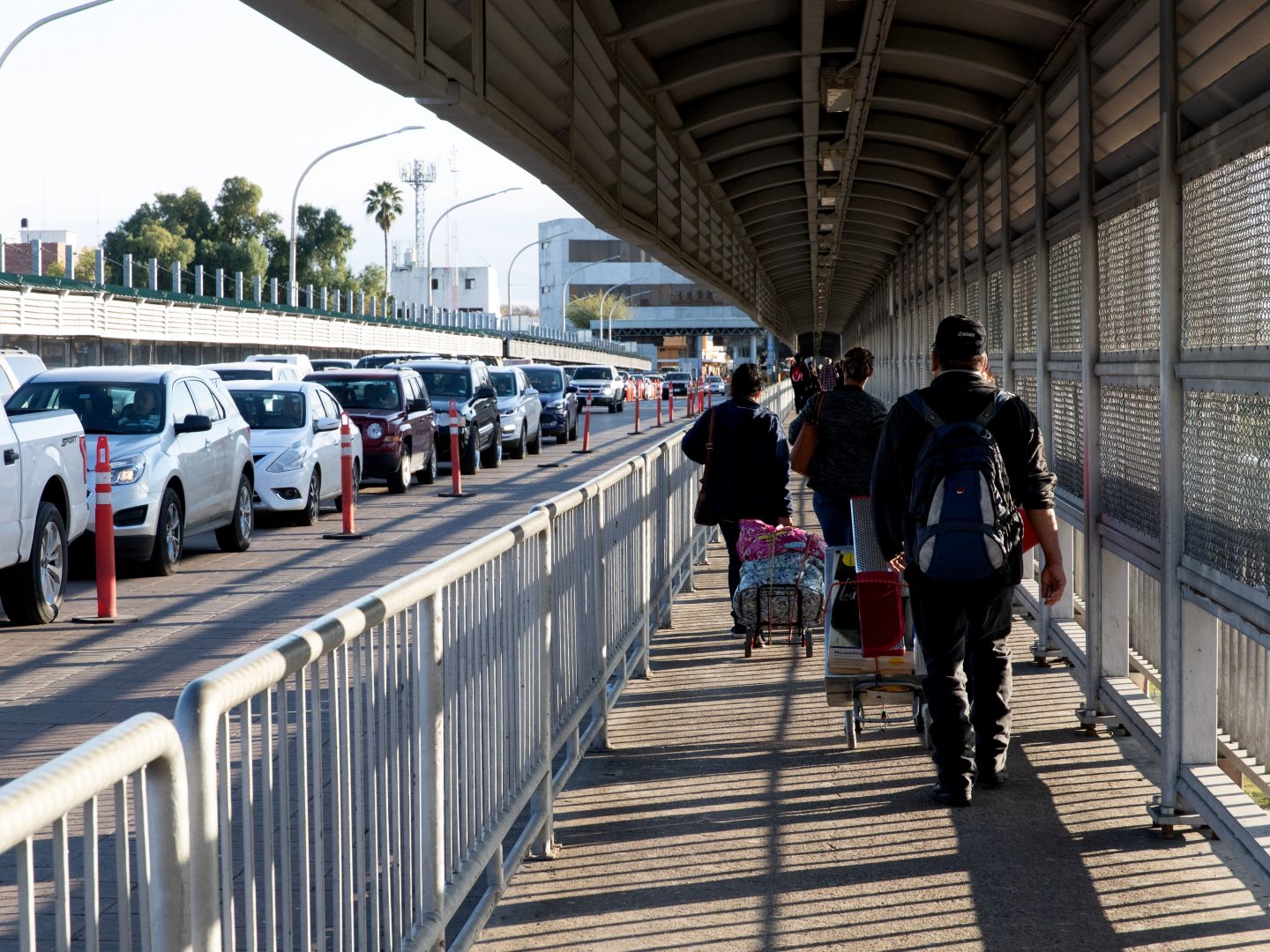 People walk and drive across a bridge on the U.S.-Mexico border in Laredo, Texas. Thousands of people cross back and forth every day, in cars or on foot.
