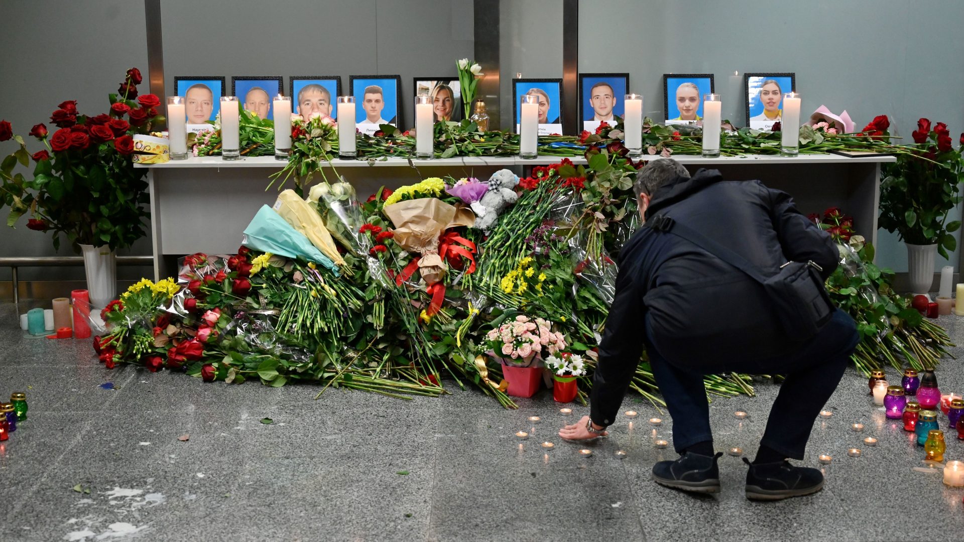 A man lays his remembrance before a memorial for the crash victims, set up Wednesday at the airport outside Ukraine's capital, Kyiv. Among the 176 victims aboard the plane were 82 Iranians, 63 Canadians and 11 Ukrainians.