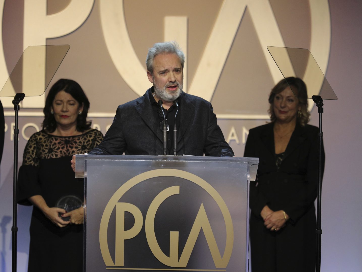 Sam Mendes, center, accepts the Darryl F. Zanuck Award for outstanding producer of theatrical motion pictures at the 31st Annual Producers Guild Awards at the Hollywood Palladium on Saturday, January 18, 2020, in Los Angeles. (Photo by John Salangsang/Invision for the Producers Guild of America/AP Images)
