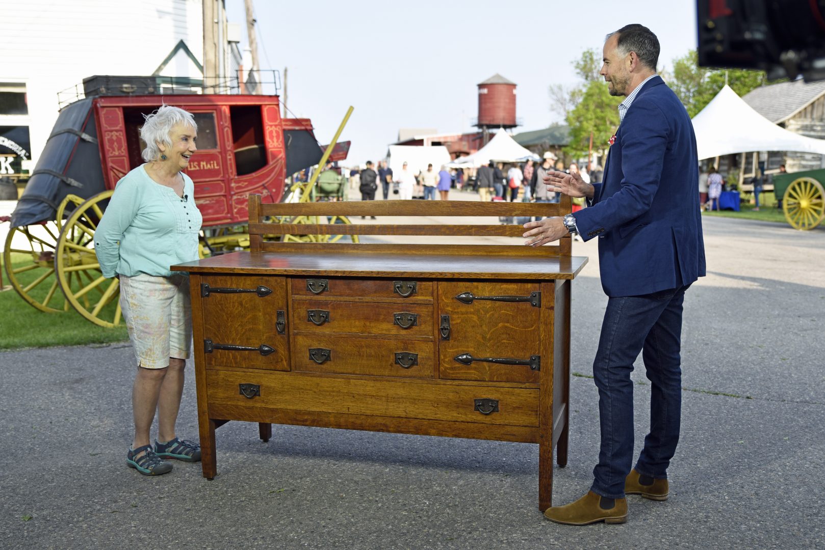 Sebastian Clarke (right) appraises a Stickley craftsman sideboard, ca. 1905 at Bonanzaville.