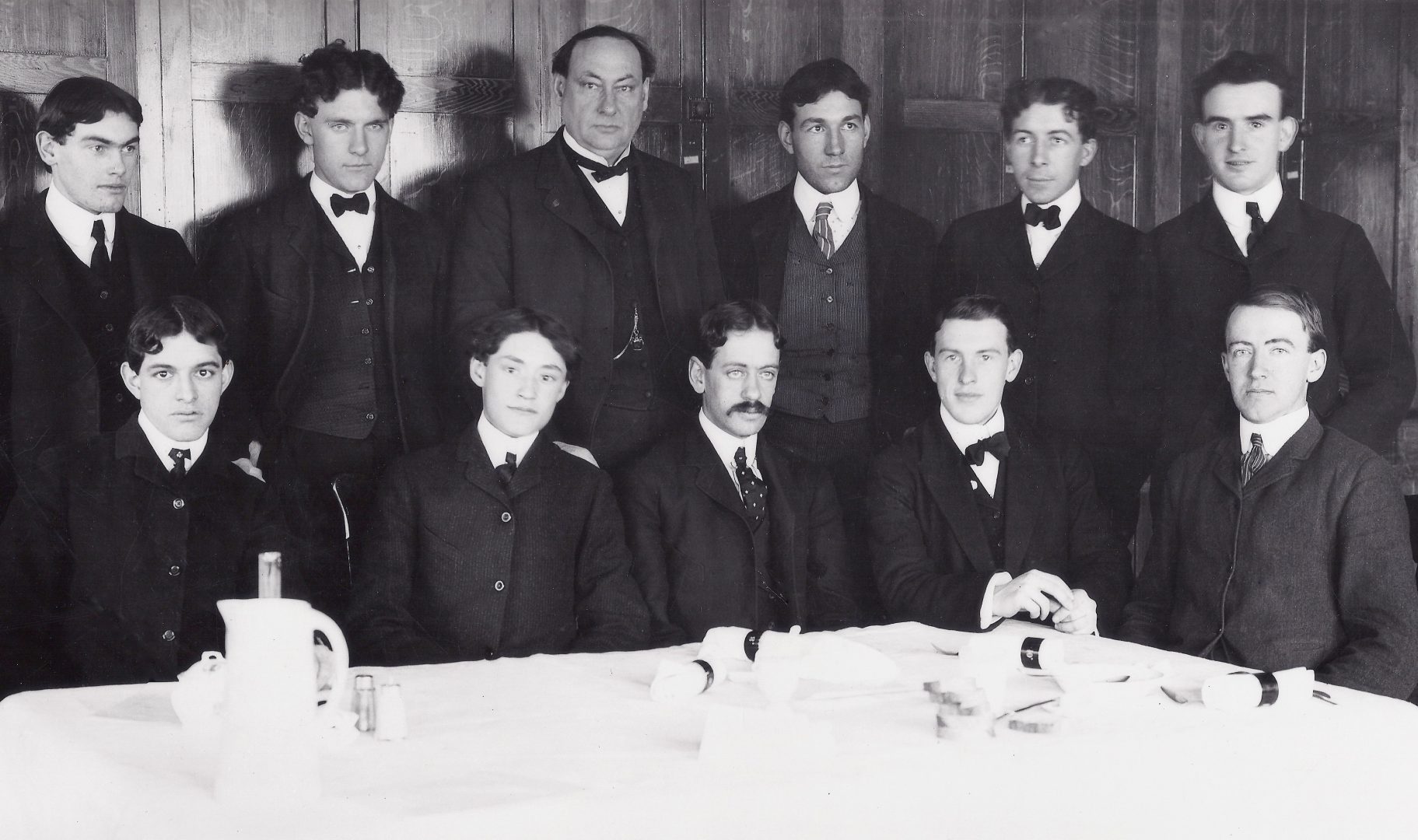 In 1902, Congress authorized funds for human trials of controversial food preservatives to determine if they could be used safely. Dr. Harvey Wiley (third from left on back row), Chief of the Bureau of Chemistry, surrounded by young men who agreed to be test subjects. They soon became known popularly as “the Poison Squad.”