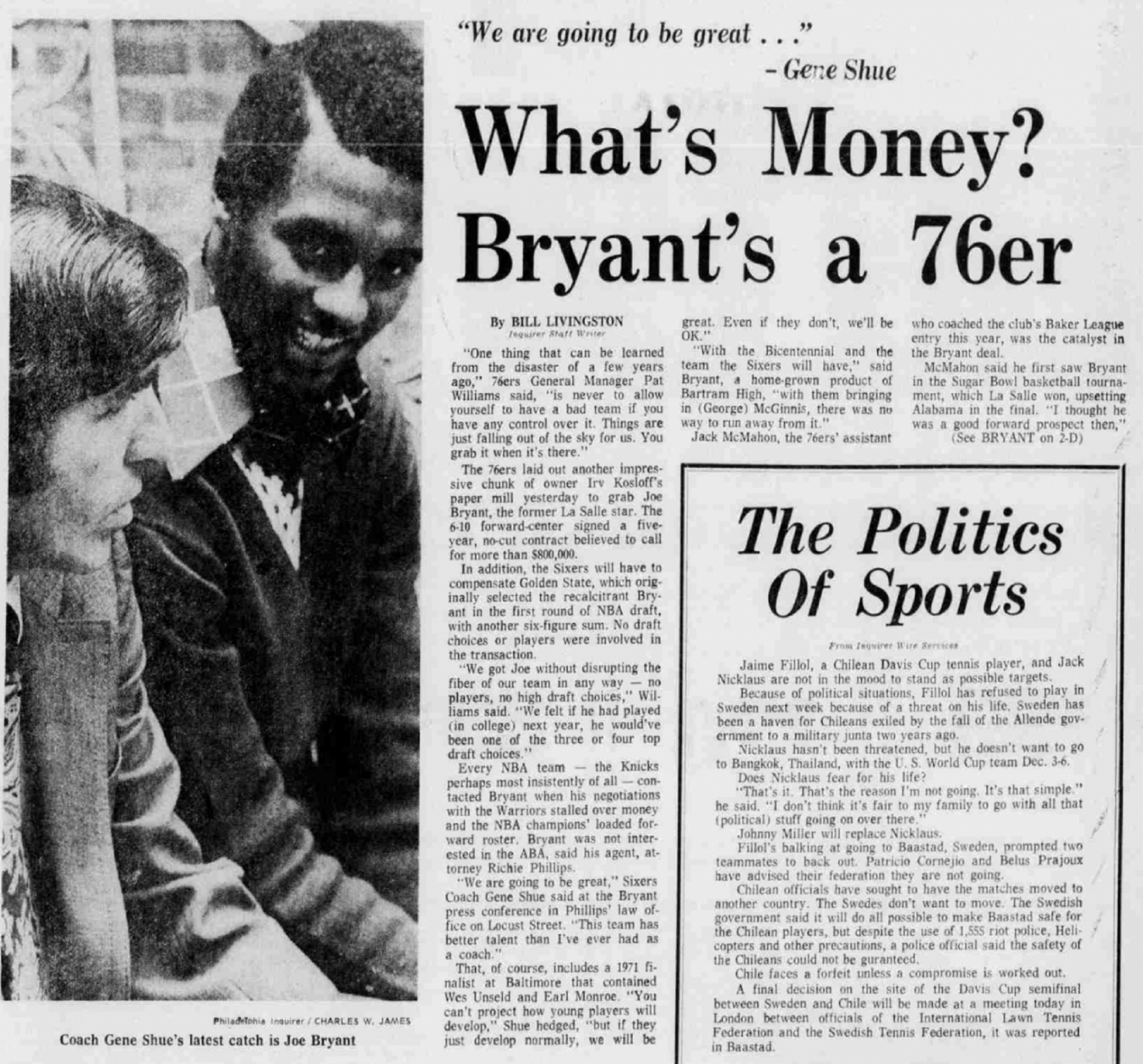 Bryant was drafted by the Golden State Warriors, who’d moved to the West Coast from Philly about a decade earlier. But Bryant and the Warriors couldn’t agree on a contract, and so the new local team — the Philadelphia 76ers — made their move.