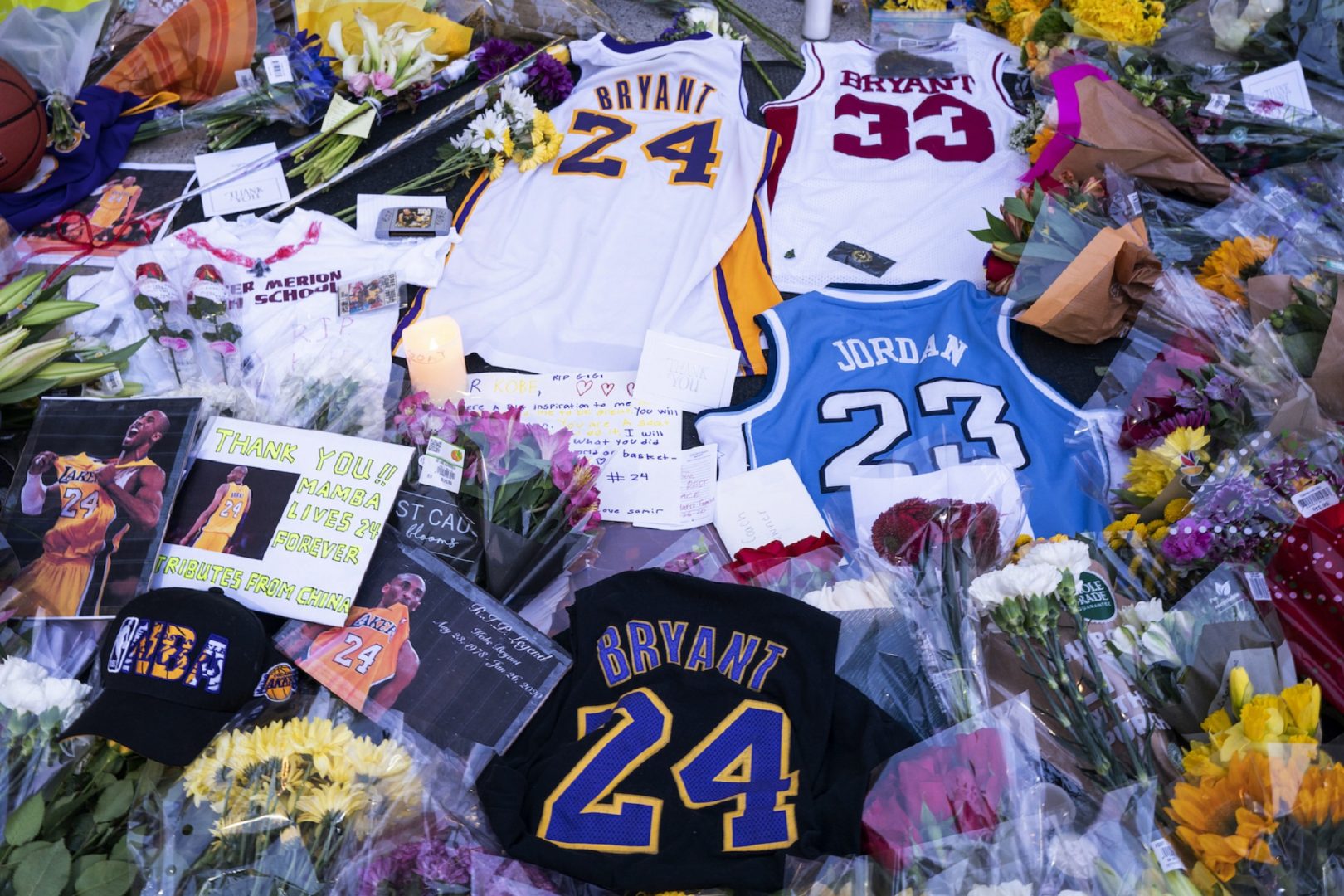 Flowers, jerseys and imagery is left in remembrance to Kobe Bryant at a small memorial at the entrance of the Bryant Gymnasium at Lower Merion High School, Monday, Jan. 27, 2020, in Wynnewood, PA. Bryant, the 18-time NBA All-Star who won five championships and became one of the greatest basketball players of his generation during a 20-year career with the Los Angeles Lakers, died in a helicopter crash Sunday, Jan. 26, 2020.
