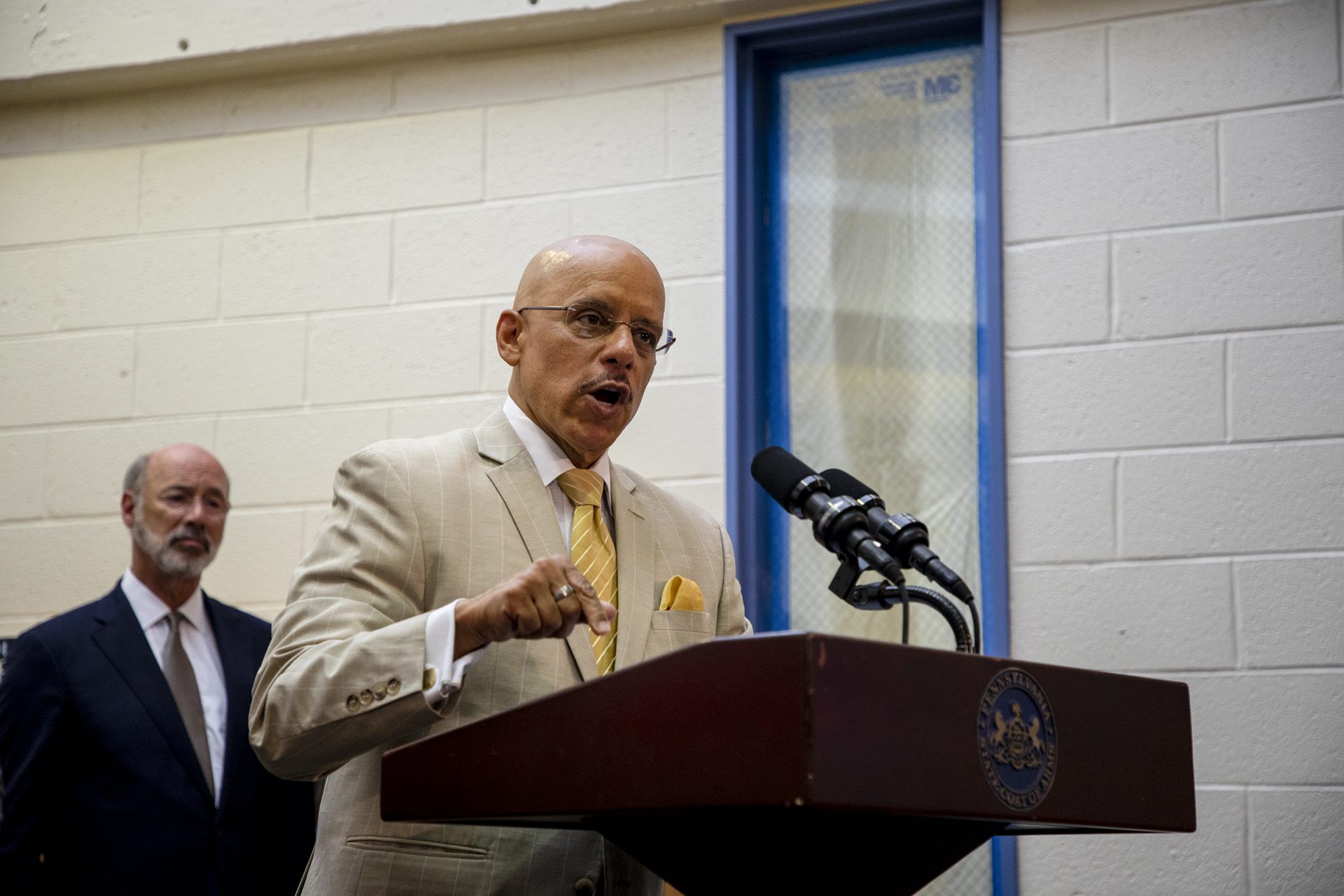 Philadelphia State Senator Vincent Hughes, speaks in front of press about the work done to create better and safer environments for schools that face problems such as lead paint or mold on Wednesday, July 31, 2019. (Tyger Williams / Philadelphia Inquirer)