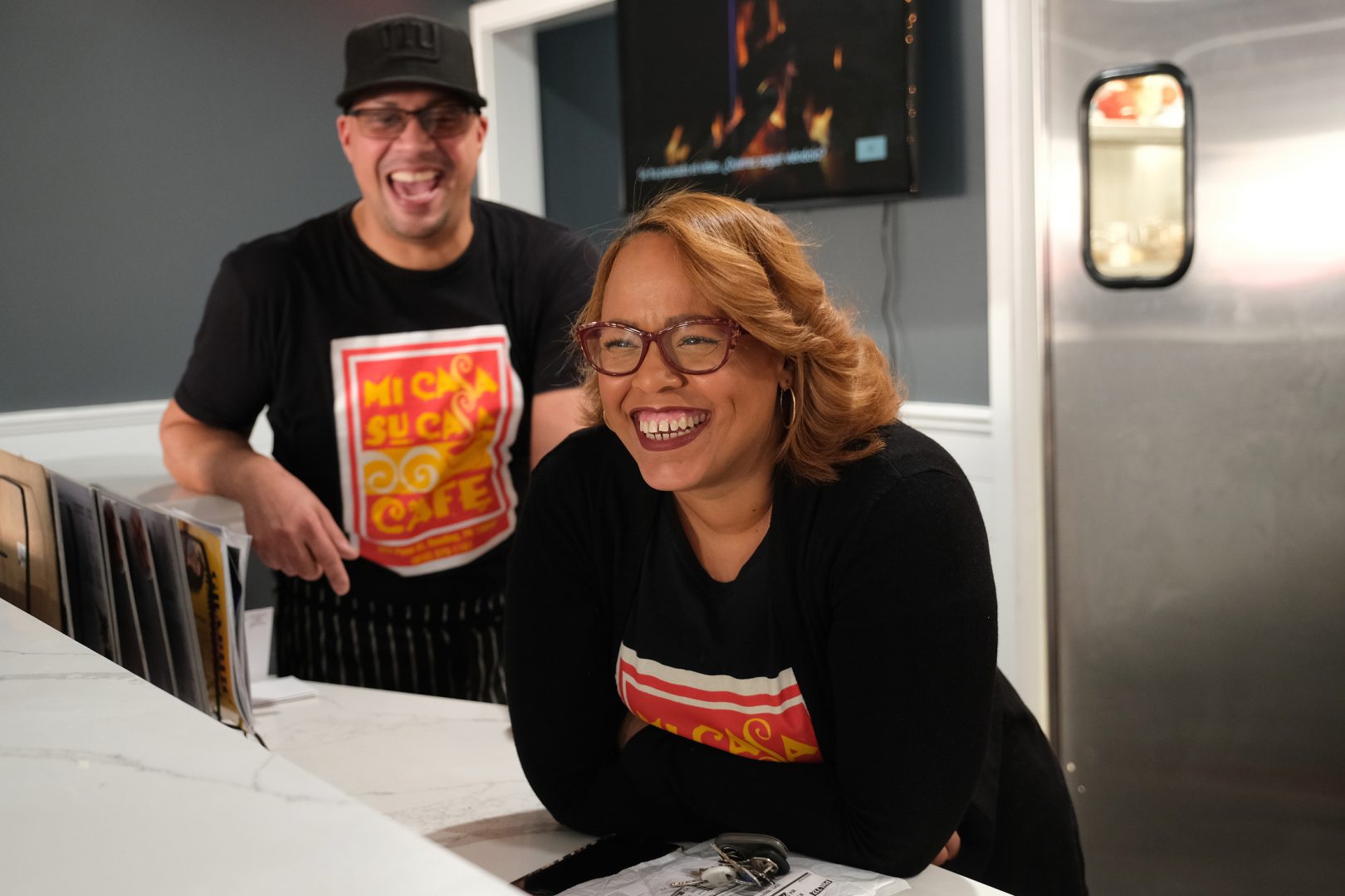 Co-owners Felix Freytiz, left, and his wife Johanny Cepeda-Freytiz share a laugh with customers Jan. 15, 2020, at Mi Casa Su Casa in Reading, Pennsylvania.