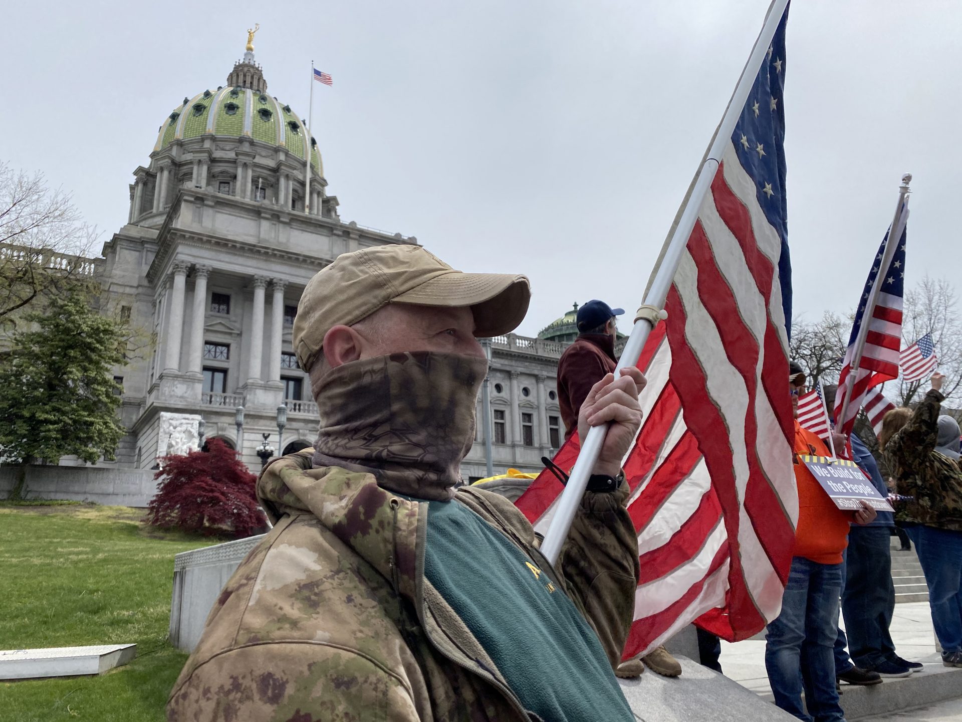 Protesters gather outside the Capitol Complex. They are calling for Gov. Tom Wolf to reopen up the state's economy during the coronavirus outbreak.