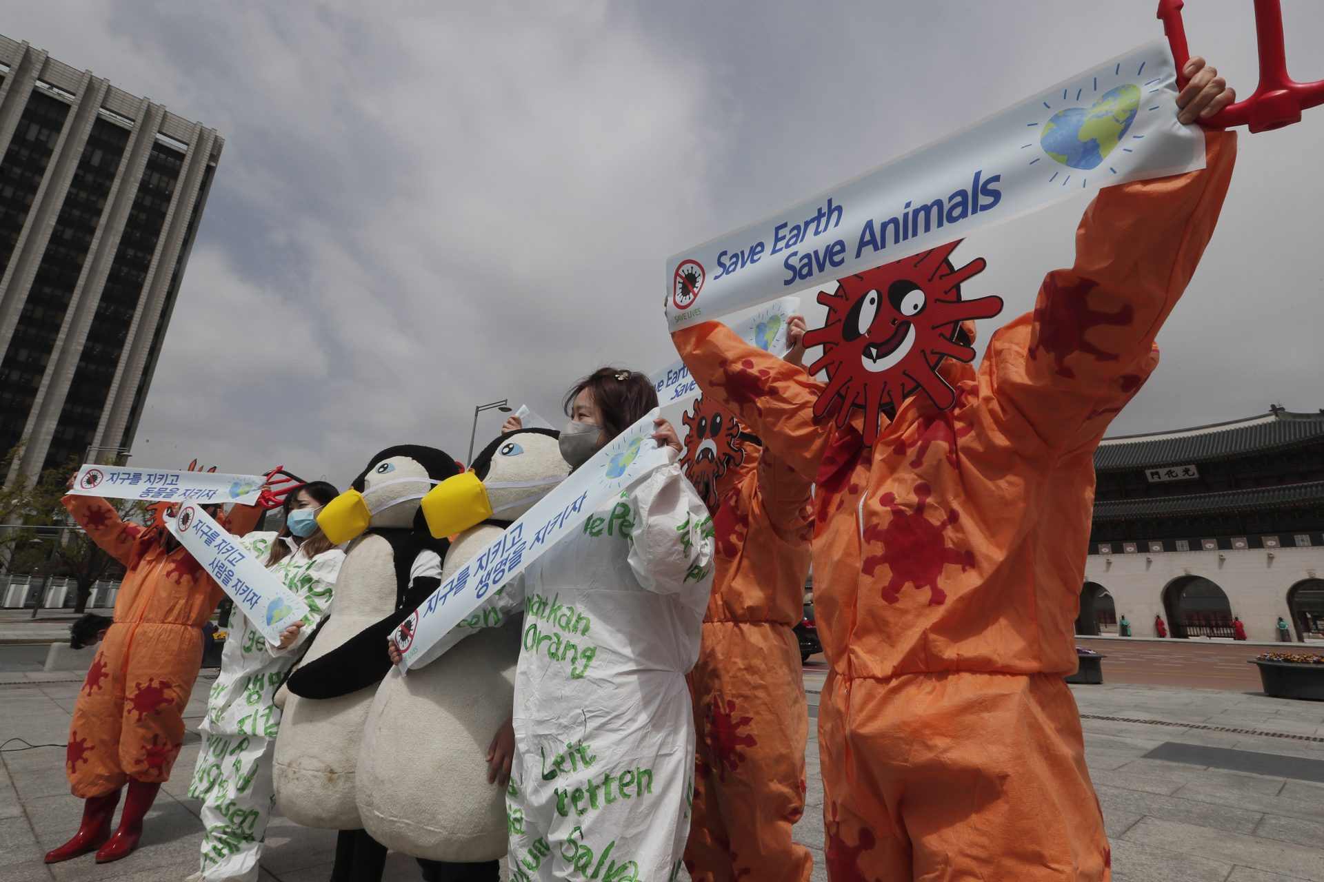 Members of the Environmental Health Citizens’ Association of Korea wear costumes representing penguins and masks representing the viruses during an event to celebrate the 50th anniversary of Earth Day at Gwanghwamun Square in Seoul, South Korea, Wednesday, April 22, 2020. For most people, the new coronavirus causes only mild or moderate symptoms, such as fever and cough. For some, especially older adults and people with existing health problems, it can cause more severe illness, including pneumonia. (AP Photo/Ahn Young-joon)