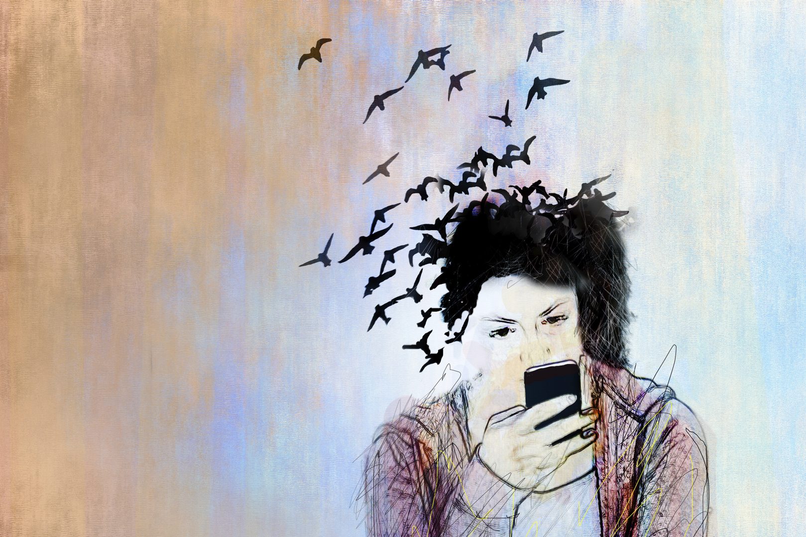 Conceptual illustration of a young woman on a smartphone her hair is turning into birds and flying away depicting loss of connection with the real world.