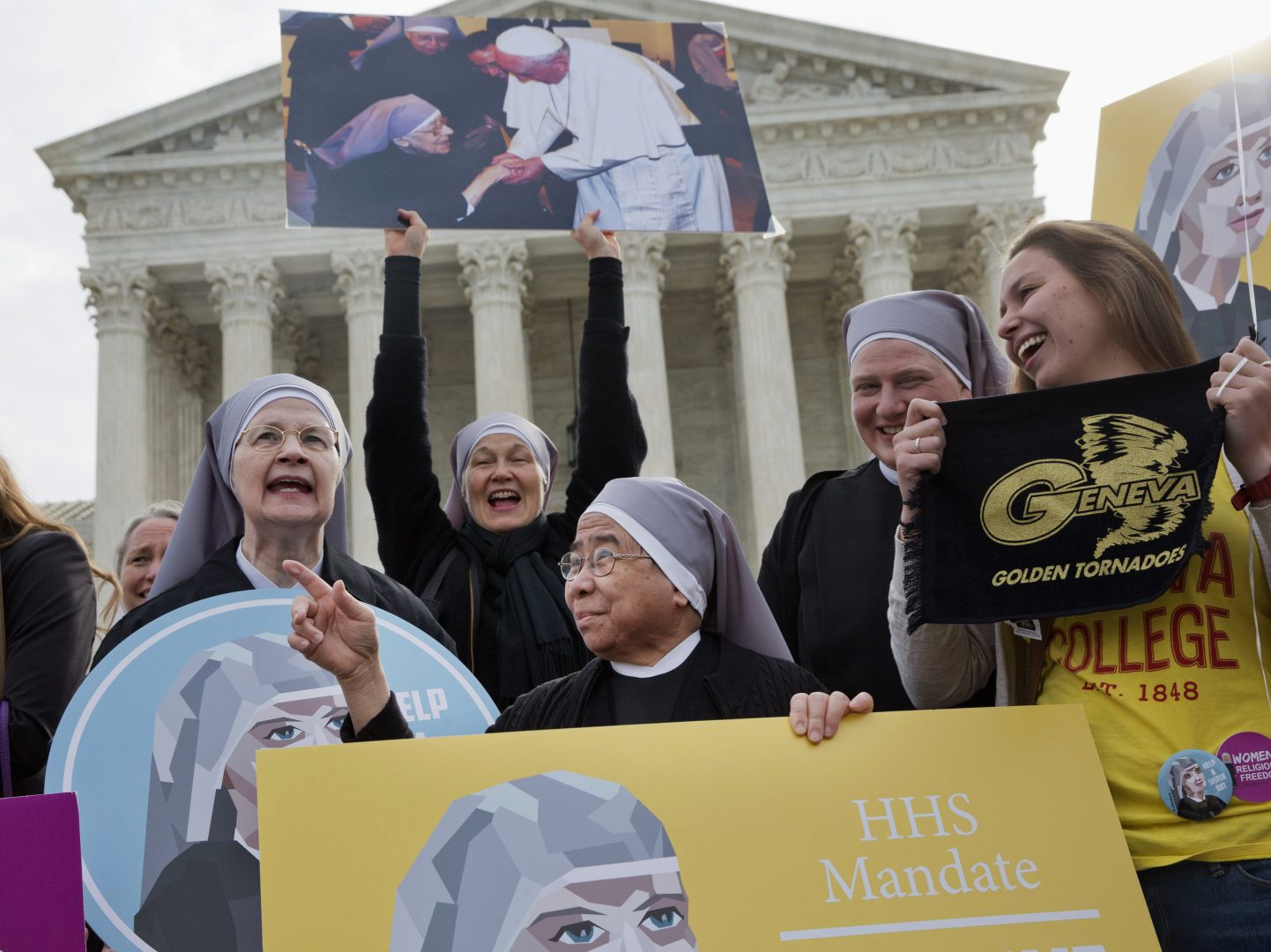 Nuns with the Little Sisters of The Poor, including Sister Celestine, left, and Sister Jeanne Veronique, center, rally outside the Supreme Court in Washington on March 23, 2016.