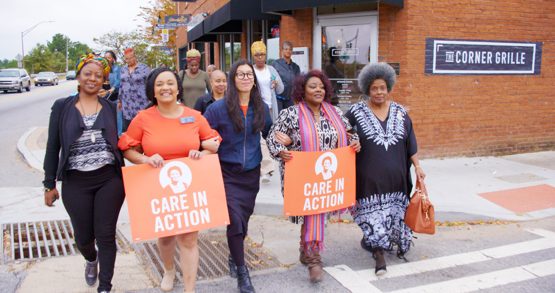 Members of Care in Action, a nonprofit, nonpartisan group dedicated to fighting for dignity and fairness for the millions of domestic workers in the United States, march in support of Georgia gubernatorial candidate Stacey Abrams.