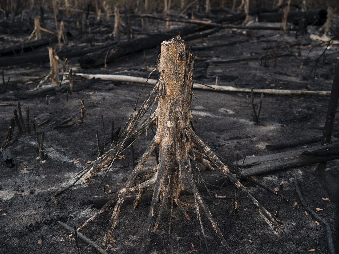 A cut tree stands in a burned area in Prainha, Para state, Brazil. A U.N. report says habitat loss is leading to more animal-to-human transmission of disease.