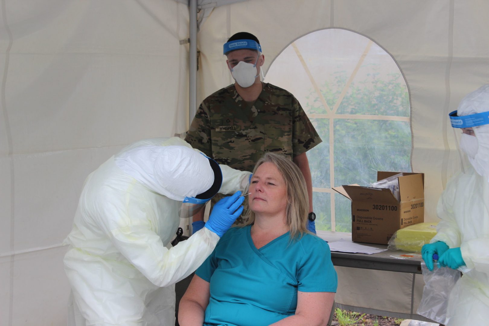 Staff Sgt. Kursty Campbell (Left) and Pfc. Ryan Whispell (Center) test a staff member at Kendal-Crosslands Nursing Home in Kennett Square, Pa., on May 26, 2020. Under guidance from the Pennsylvania Department of Health, and closely monitored by CDC officials, Pennsylvania National Guard members with Task Force Iroquois, launched a Point Prevalence Sampling Strike Team at Kendal-Crosslands.