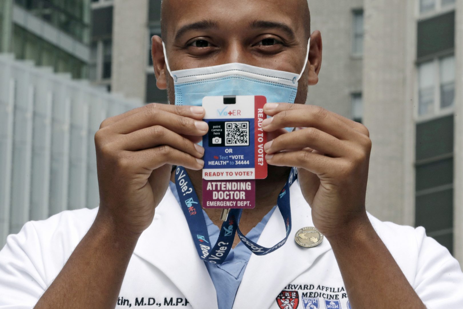 Alister Martin, an emergency room doctor at Massachusetts General Hospital, holds up a voter information card he wears on his ID lanyard, which gives patients a Q-code and text link to help them register to vote, outside the hospital, Friday, Aug. 7, 2020, in Boston. Martin founded the organization "VotER" to provide medical professionals voter registration resources for patients who are unregistered voters.