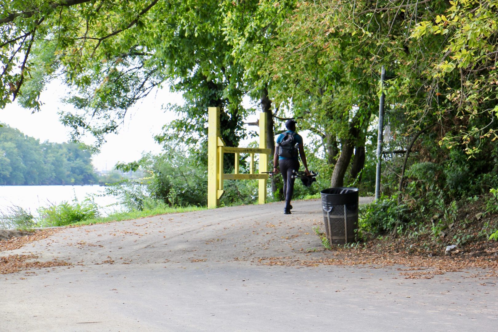 A fisherman walks along the Schuylkill River Trail at Bartram's Gardens.