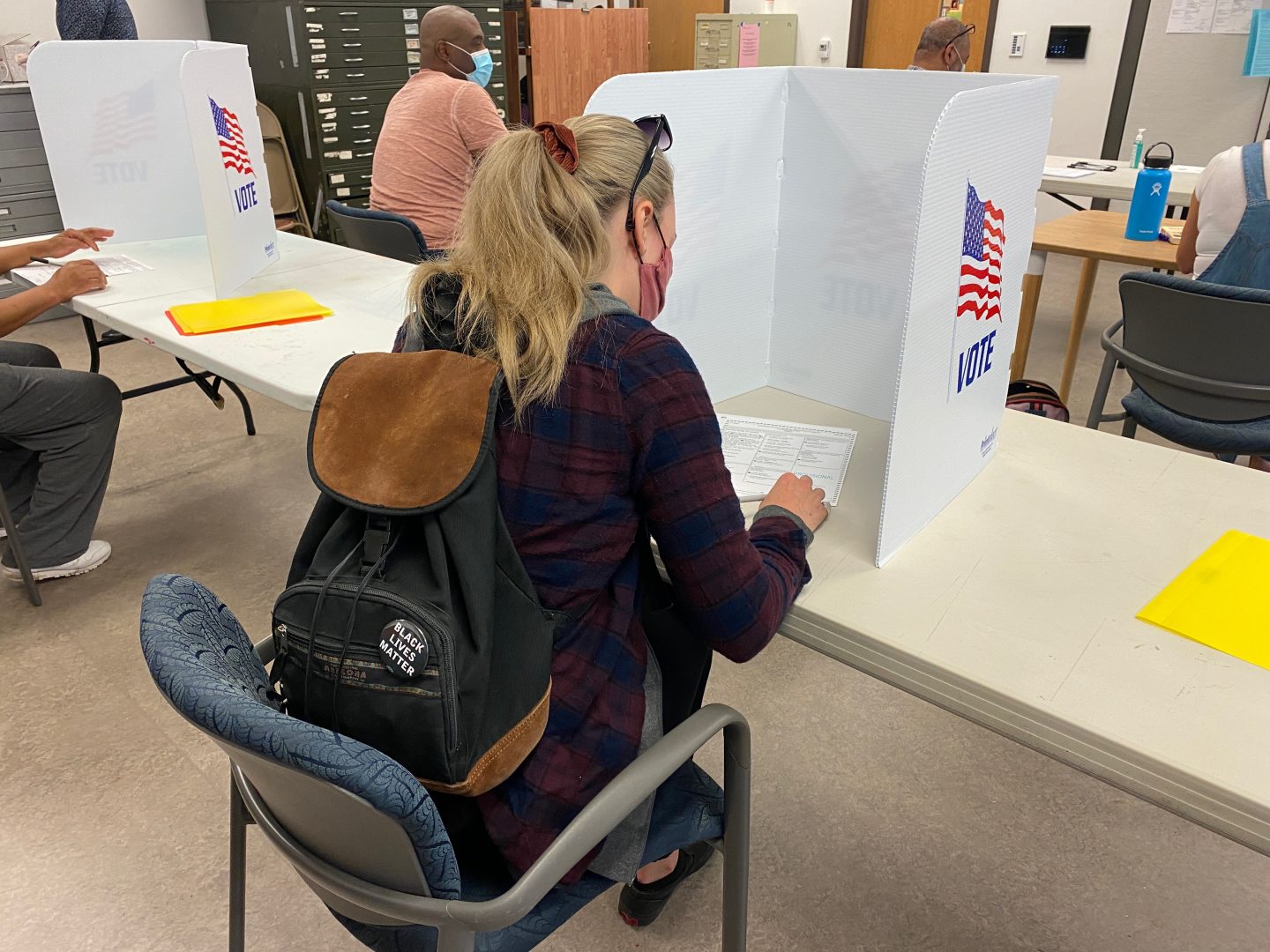 A woman fills out her ballot at Harrisburg's 6th Ward, located in the Susquehanna Art Museum, on June 2, 2020.