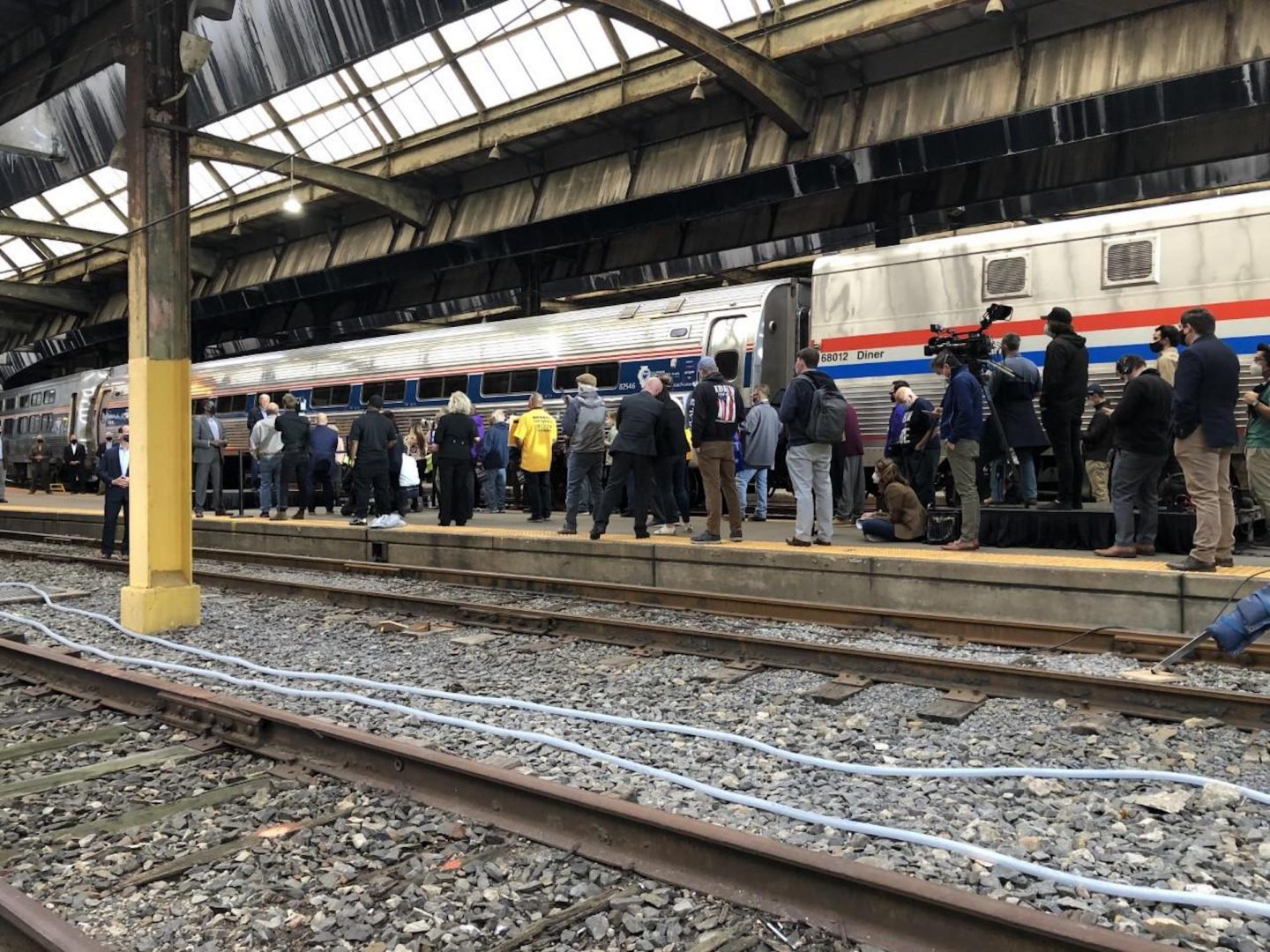 Biden spoke for about one quarter-hour before a union-friendly crowd of roughly 50 gathered at Pittsburgh’s Downtown Amtrak station. The stop was part of a one-day whistlestop tour, with crowds kept small to reduce the spread of the coronavirus.