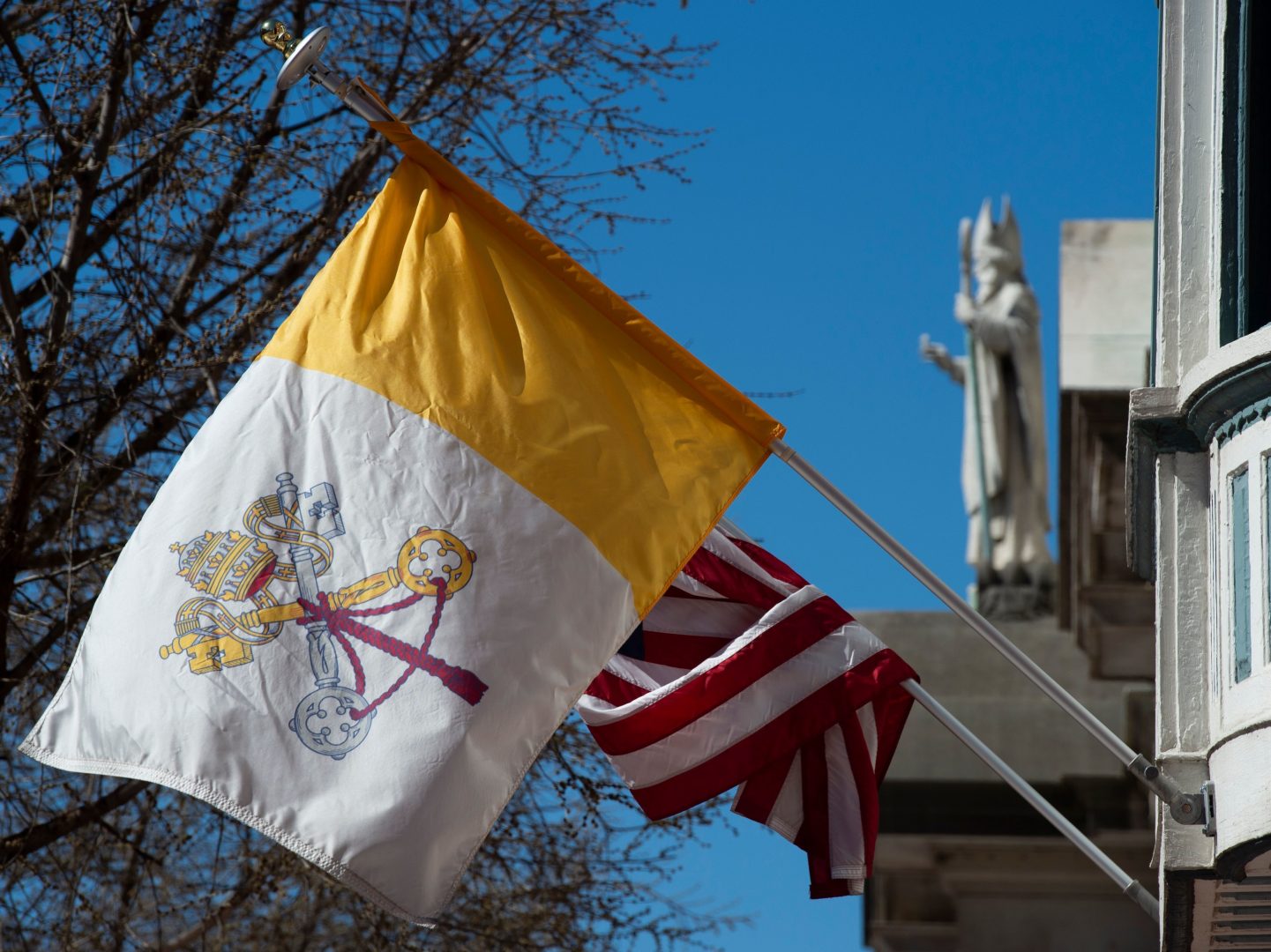 The US national flag and flag of Vatican City are hung on the outside of the Pennsylvania Catholic Conference building in Harrisburg, Pennsylvania on March 26, 2019.