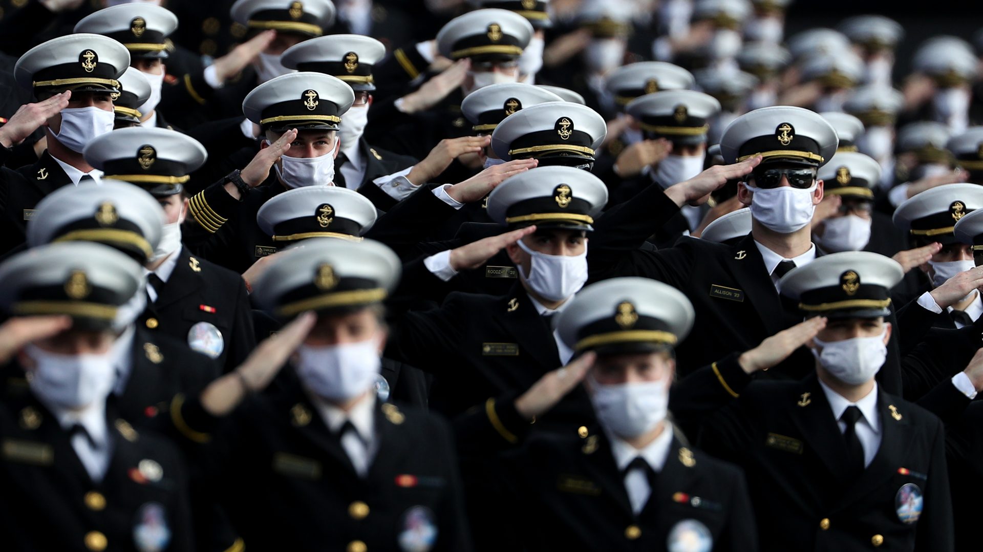 ANNAPOLIS, MARYLAND - OCTOBER 24: Midshipmen wearing face masks stand and salute for the U.S. National Anthem before the Navy Midshipmen play against the Houston Cougars at Navy-Marine Corps Memorial Stadium on October 24, 2020 in Annapolis, Maryland. Due to the Covid-19 pandemic, Navy athletics announced they would not allow general admission fans, only midshipmen. (Photo by Patrick Smith/Getty Images)