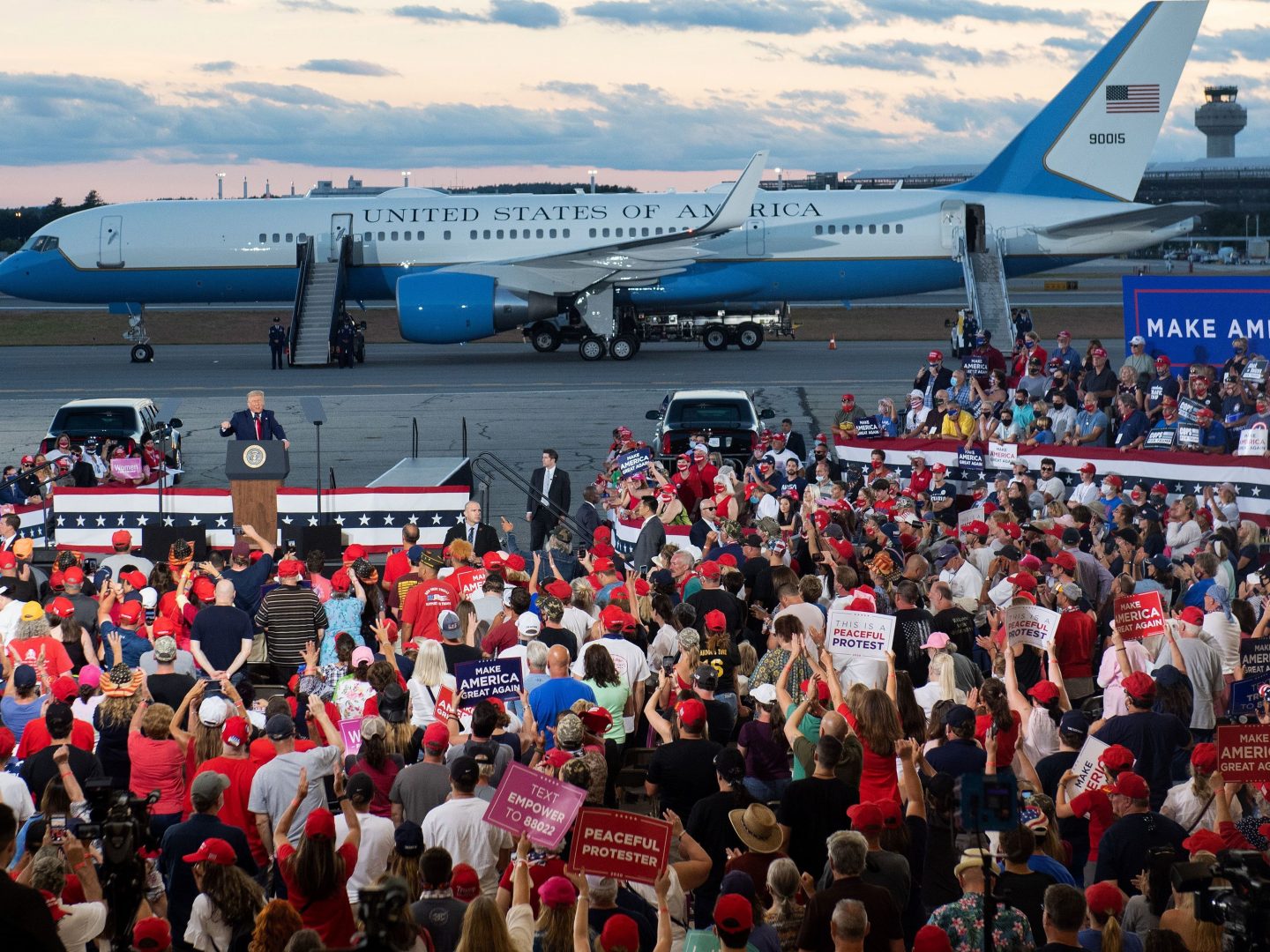 US President Donald Trump addresses supporters during a campaign rally at Manchester - Boston Regional Airport in Londonderry, New Hampshire, August 28, 2020.