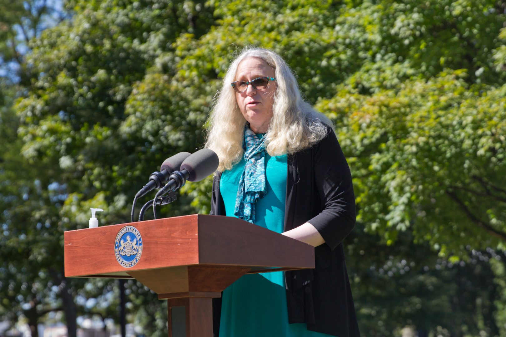 Pa. Health Secretary Rachel Levine encourages Pennsylvanians to download the COVID AlertPA, which notifies users when they’ve been in contact with the virus, during a press event on Sept. 22, 2020.