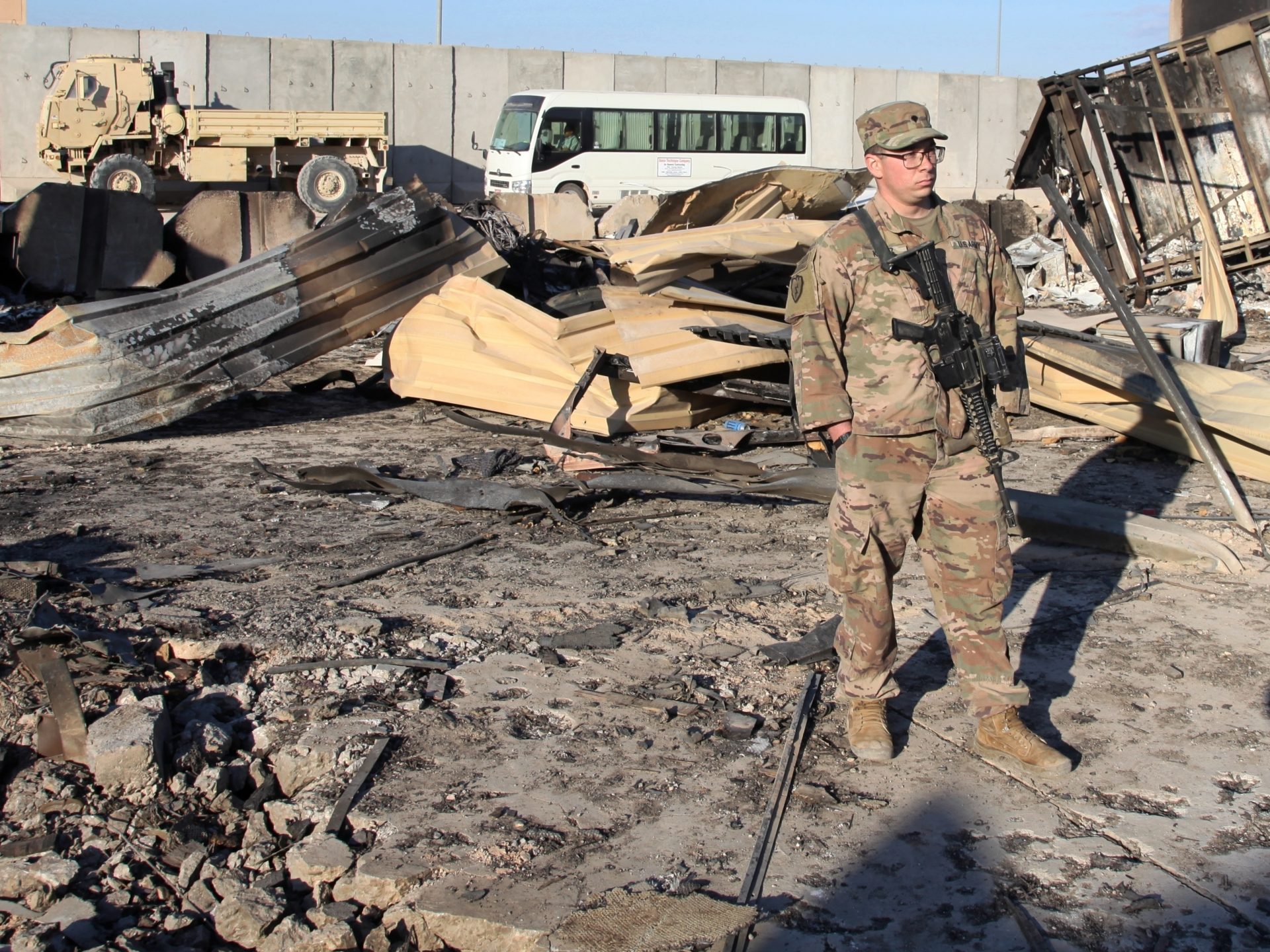 In this Monday, Jan. 13, 2020 photo, A U.S. Soldier stands at the spot hit by Iranian bombing at Ain al-Asad air base, in Anbar, Iraq. Ain al-Asad air base was struck by a barrage of Iranian missiles on Wednesday, in retaliation for the U.S. drone strike that killed atop Iranian commander, Gen. Qassem Soleimani, whose killing raised fears of a wider war in the Middle East.