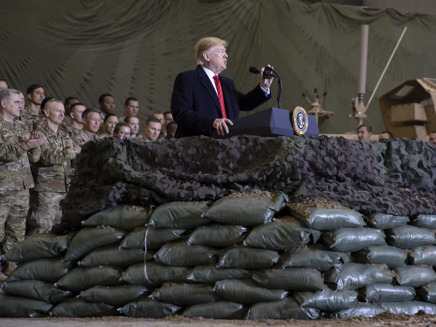 President Trump speaks to U.S. troops at Bagram Airfield, Afghanistan, on Thanksgiving Day 2019. The Trump administration says it's cutting U.S. forces from 4,500 to 2,500 troops in Afghanistan, one of several abrupt military moves announced recently.