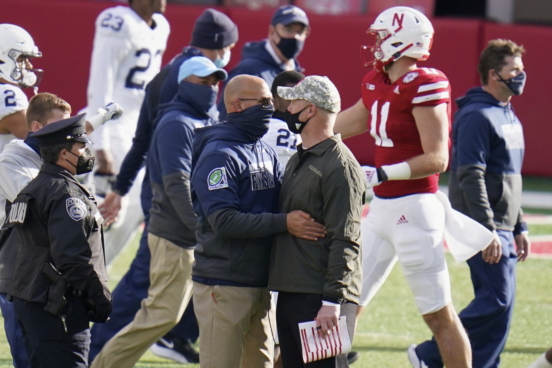Nebraska head coach Scott Frost, right, meets with Penn State head coach James Franklin, following an NCAA college football game in Lincoln, Neb., Saturday, Nov. 14, 2020. Nebraska won 30-23. (AP Photo/Nati Harnik)