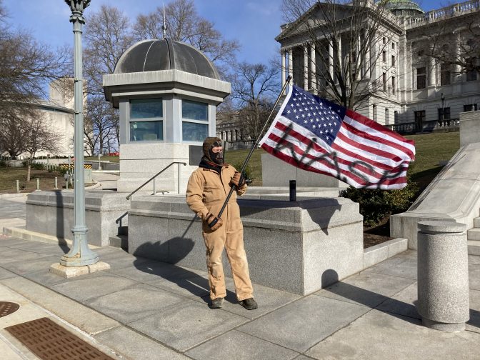 Ryan Stevenson demonstrated outside the Pennsylvania State Capitol as Joe Biden and Kamala Harris were being inaugurated.