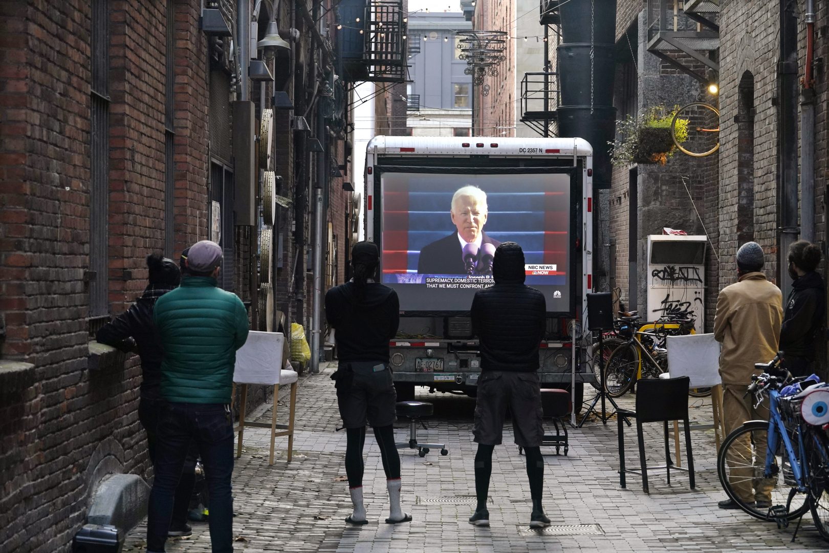Bicyclists stand in an alley to watch the inauguration of President Joe Biden on a large video screen before a "Peace Peloton" bicycle ride Wednesday, Jan. 20, 2021, in Seattle.