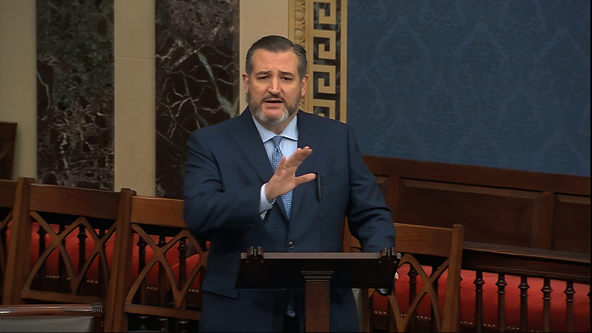 In this image from video, Sen. Ted Cruz, R-Texas, speaks on the Senate floor about the impeachment trial against President Donald Trump at the U.S. Capitol in Washington, Tuesday, Feb. 4, 2020. The Senate will vote on the Articles of Impeachment on Wednesday afternoon, Feb. 5.