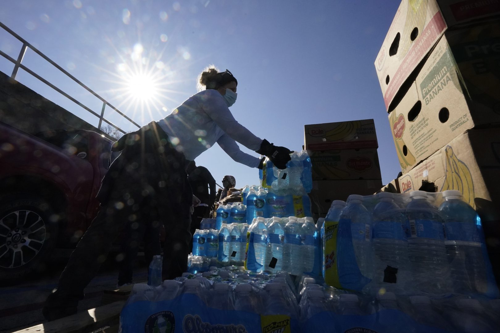 Volunteers load water for people at a San Antonio Food Bank drive-through food distribution site held at Rackspace Technology, Friday, Feb. 19, 2021, in San Antonio. (AP Photo/Eric Gay)