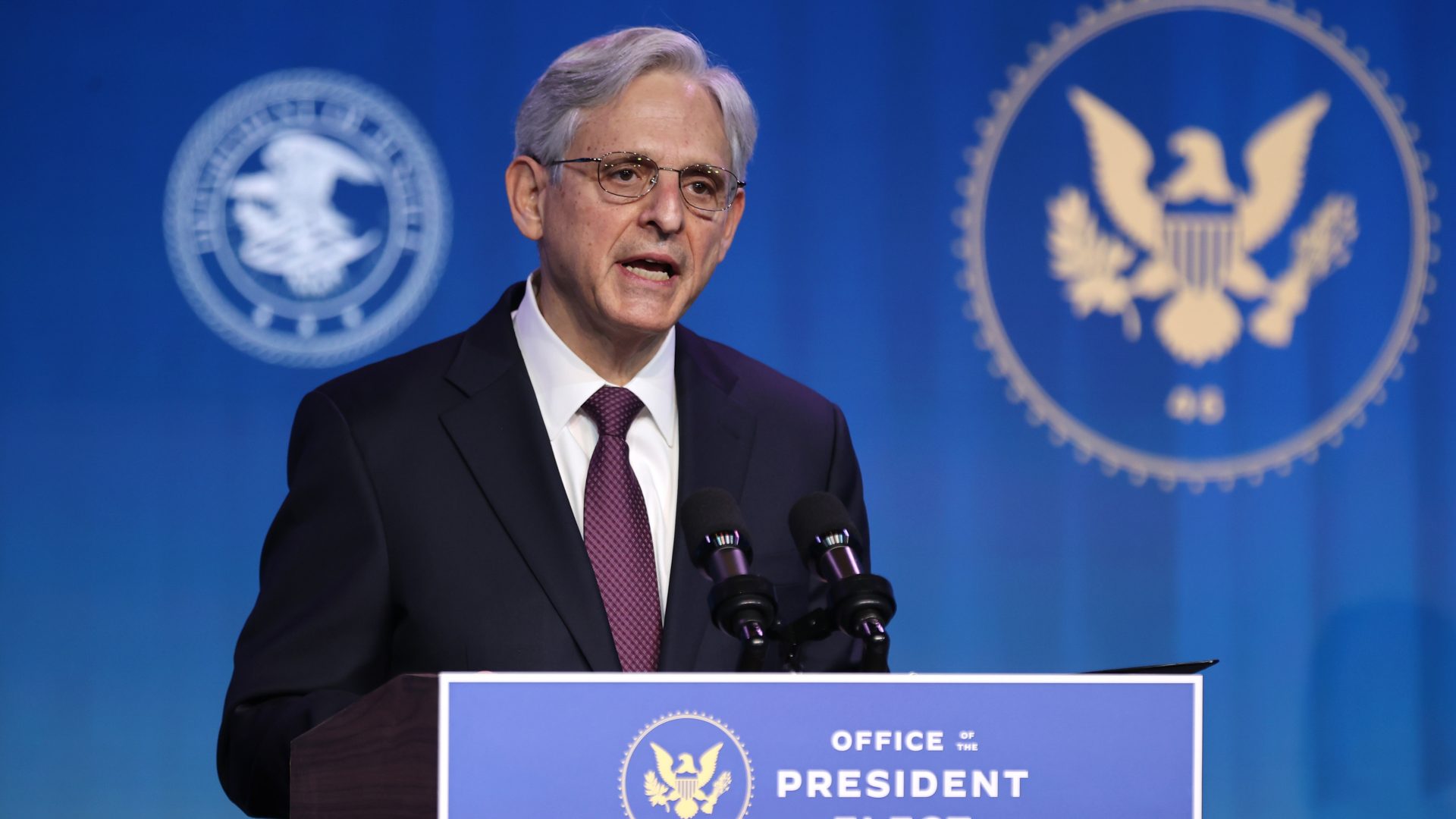 WILMINGTON, DELAWARE - JANUARY 07: Federal Judge Merrick Garland delivers remarks after being nominated to be U.S. attorney general by President-elect Joe Biden at The Queen theater January 07, 2021 in Wilmington, Delaware. Garland, who serves as a judge of the U.S. Court of Appeals for the District of Columbia Circuit, was nominated to the Supreme Court by President Barack Obama in 2016 but Senate Republicans refused him a hearing or confirmation vote.