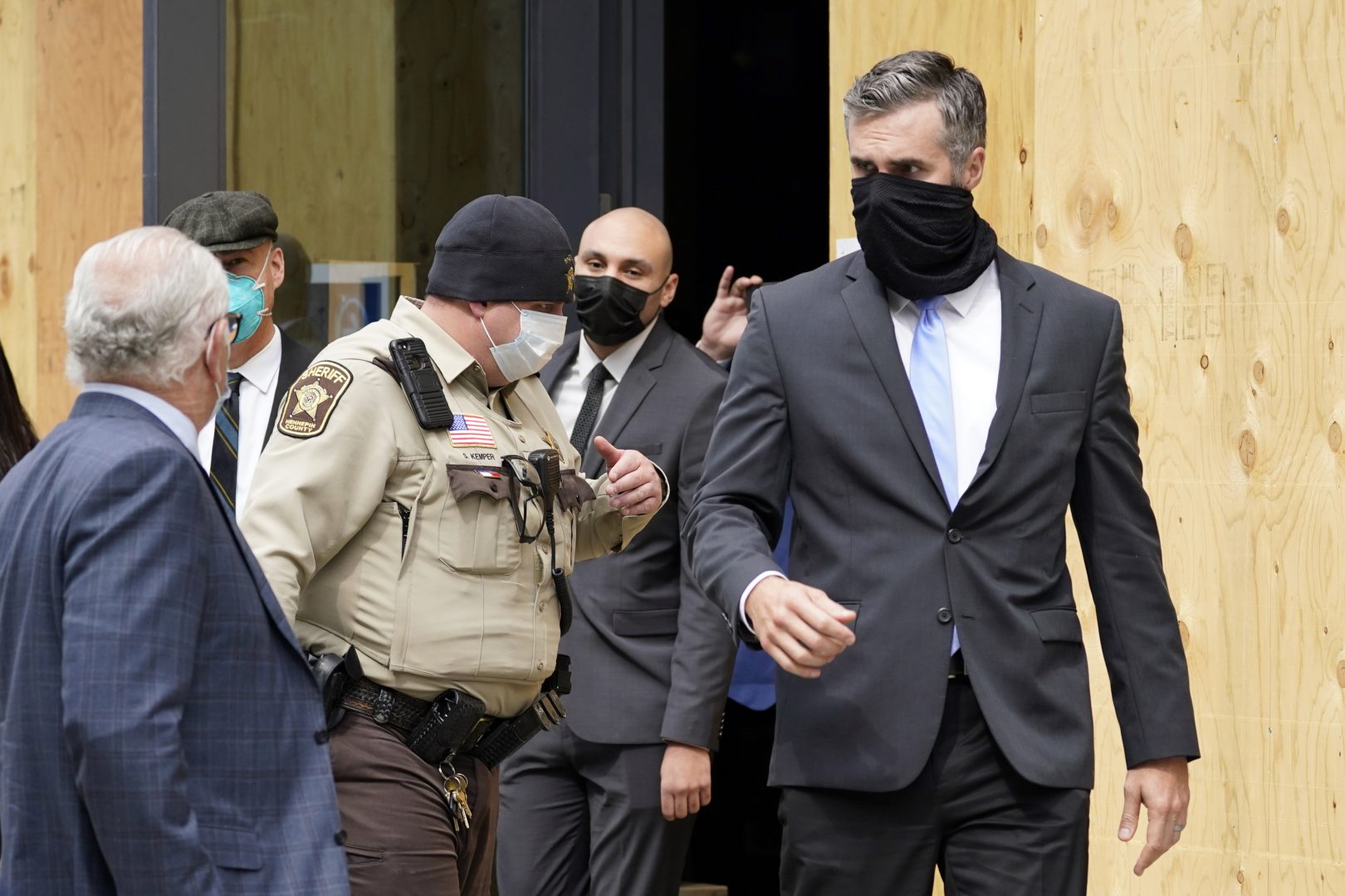 Former Minneapolis Police officers Thomas Lane, right, and J. Alexander Kueng, second from right, are escorted out of the Hennepin County Family Justice Center Friday, Sept. 11, 2020, in Minneapolis, after a hearing for the four Minneapolis police officers who are charged in the death of George Floyd.